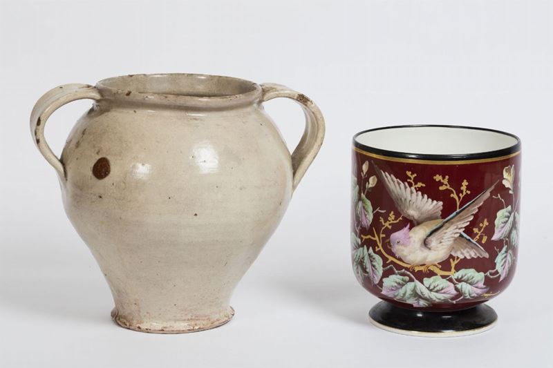 Lotto composto da un orcio in terracotta, un cachepot in porcellana e un vaso in vetro sagomato.