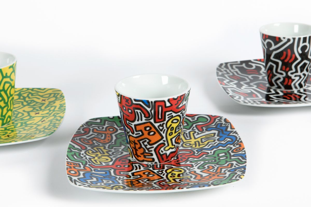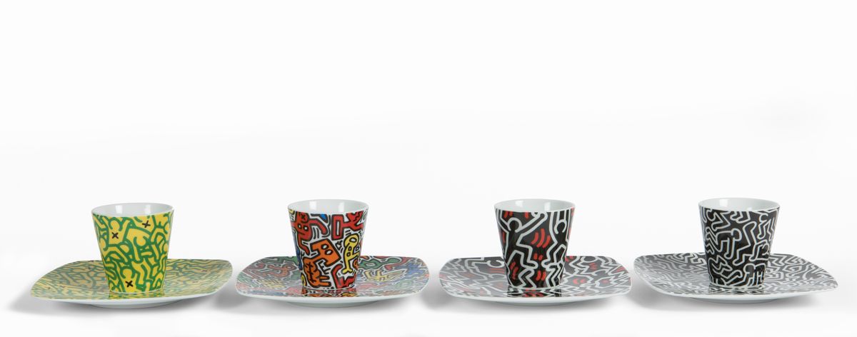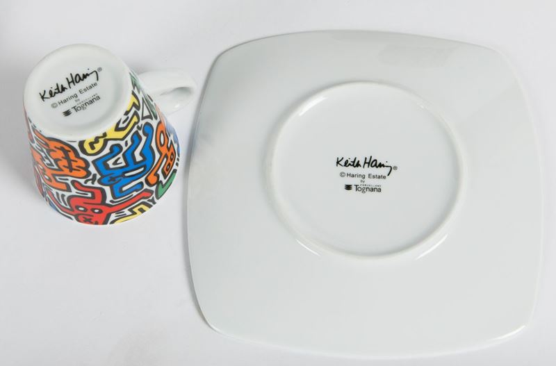 Quattro tazze e quattro piatti in porcellana con decoro a serigrafia.