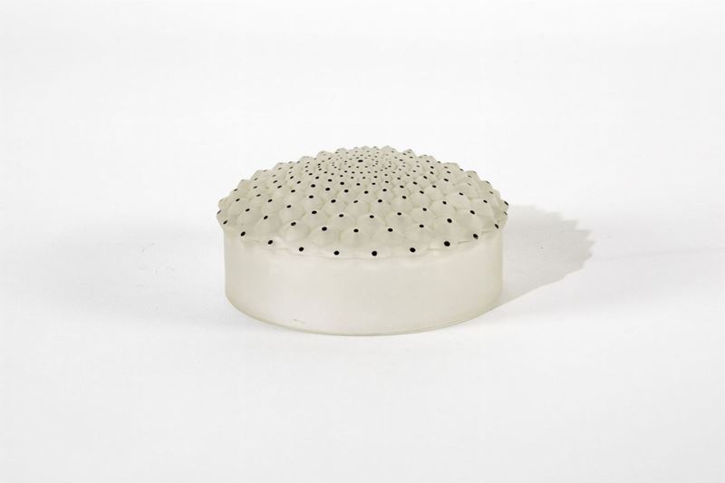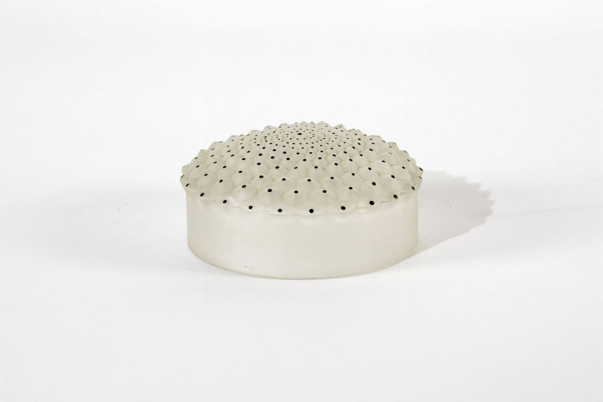Coperchio di scatola in vetro sabbiato con decoro a smalti.