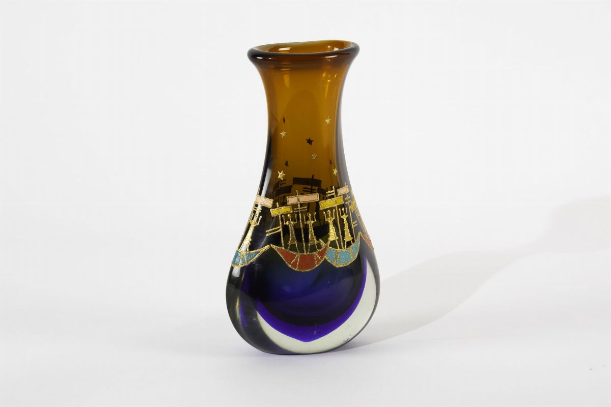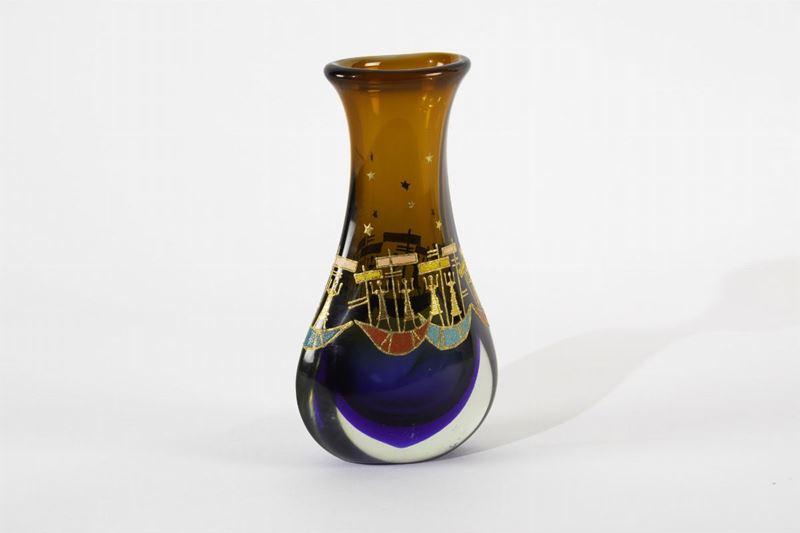 Vaso in vetro sommerso bicolore con decoro di gondole.