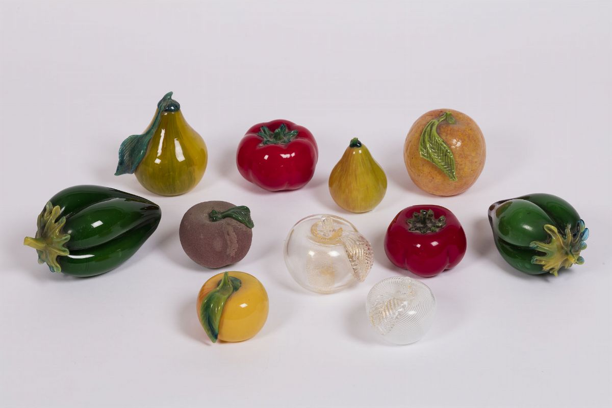 Lotto composto da undici frutti in vetro soffiato policromo.