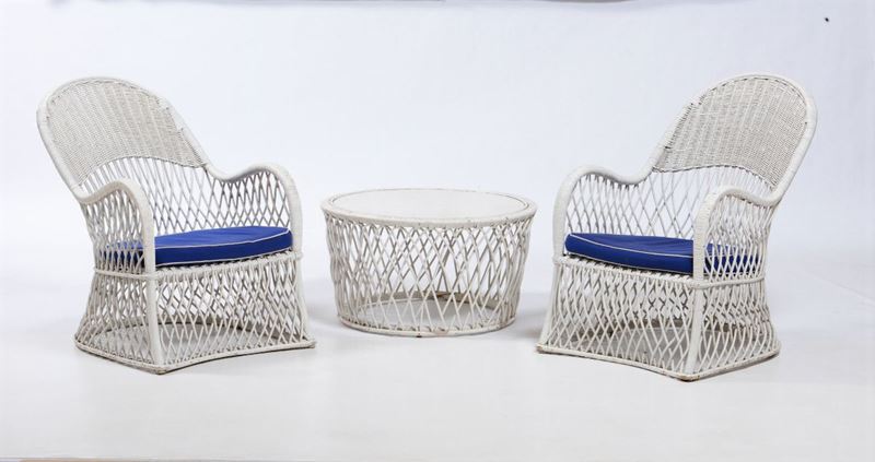 Salotto da esterno composto da due poltrone e un tavolo basso con struttura in giunco e vimini laccati.
