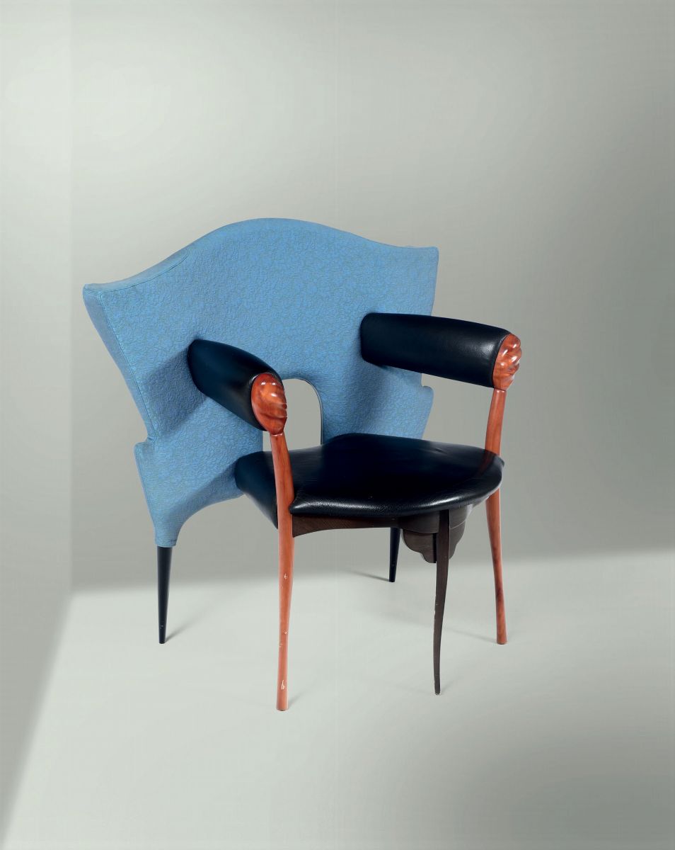 Poltrona mod. Prosim Sedni con struttura in legno e rivestimenti in cuoio e tessuto.