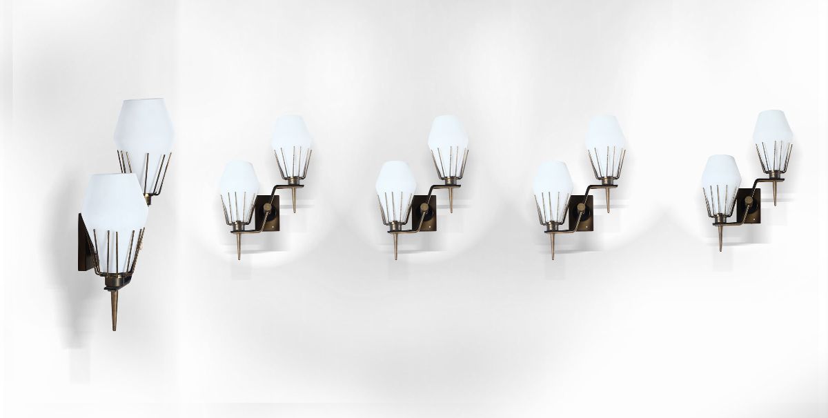 Cinque appliques con struttura in ottone e diffusori in vetro opalino.