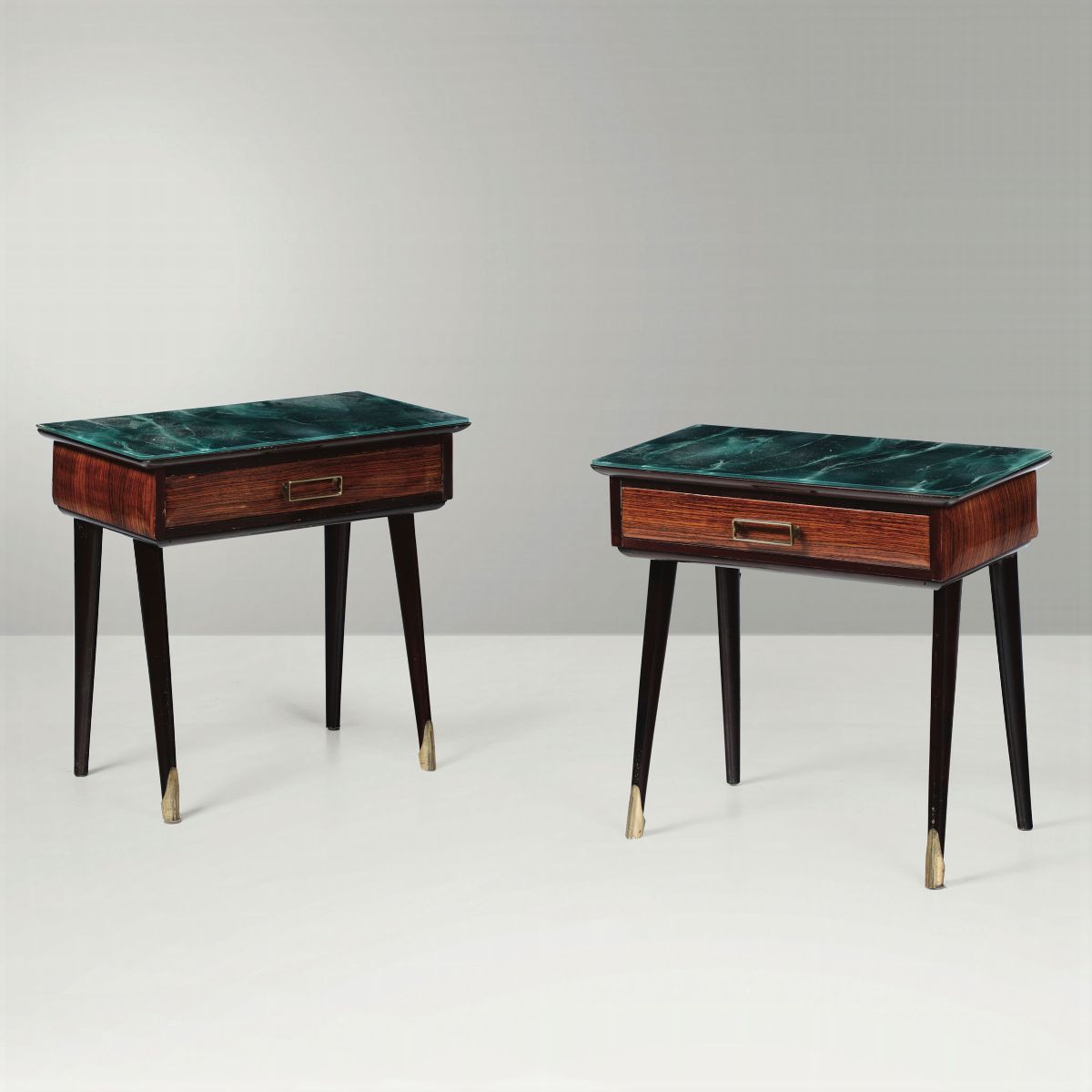 Due comodini con struttura in legno e legno ebanizzato. Puntali in ottone e piani in vetro marmorizzato.