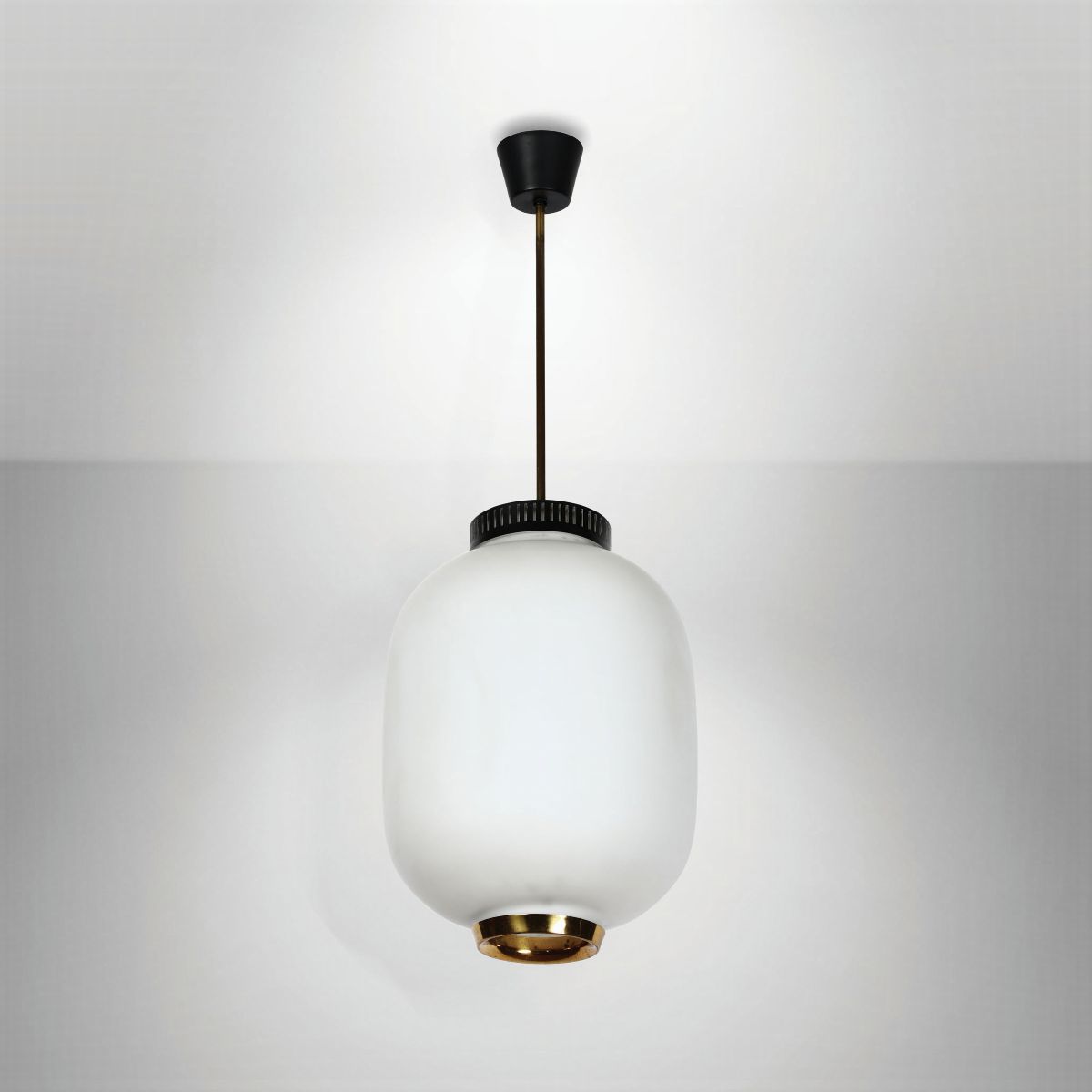 Lampada a sospensione con struttura in ottone e diffusore in vetro opalino.