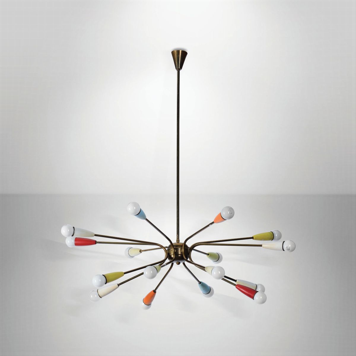 Lampada a sospensione con struttura in ottone e metacrilato colorato.
