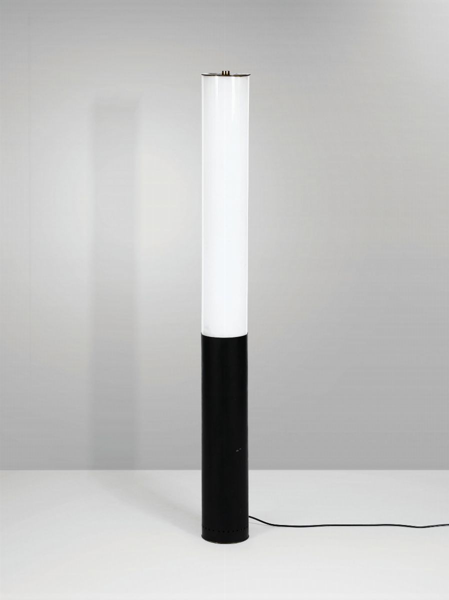 Lampada da terra con struttura in ottone, base in metallo laccato e paralume in perspex.