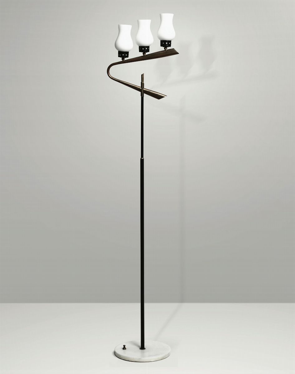 Lampada da terra con struttura in ottone e ottone laccato. Base in marmo e diffusori in vetro opalino.