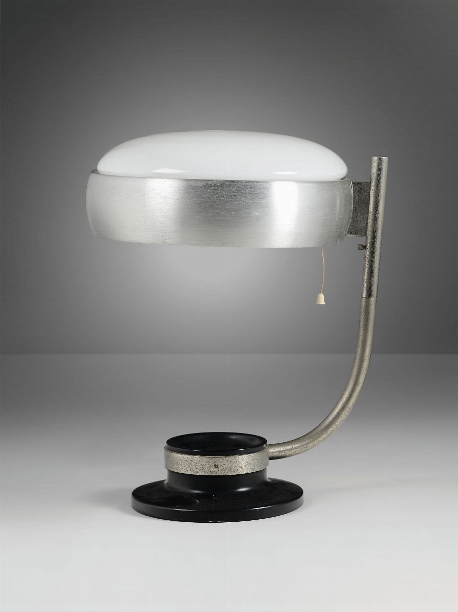Lampada da tavolo con struttura in ottone nichelato e diffusore in vetro.
