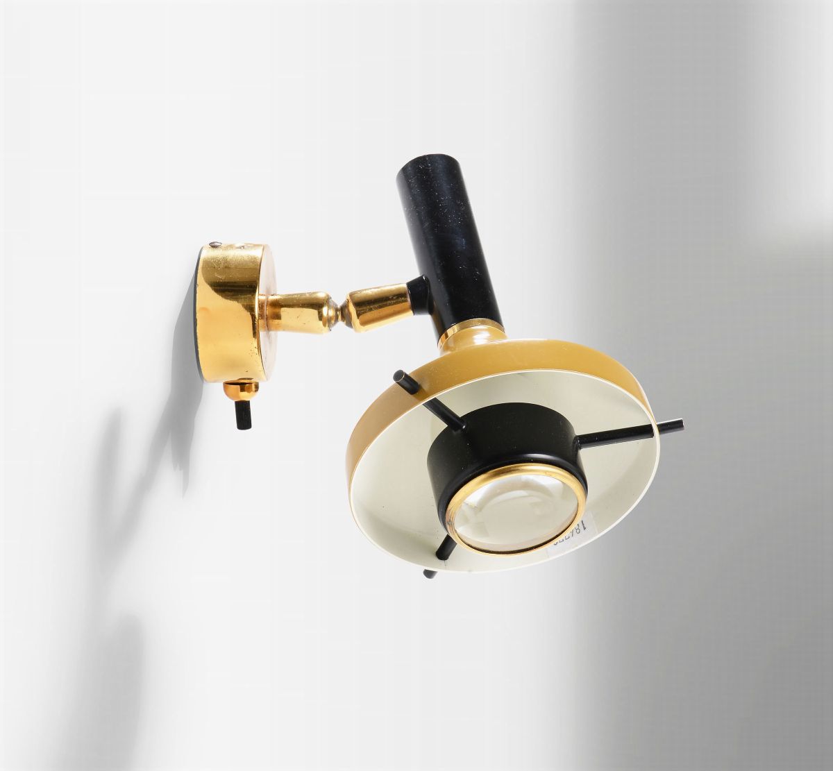 Lampada da parete con struttura in ottone e metallo laccato. Elemento diffusore in vetro.