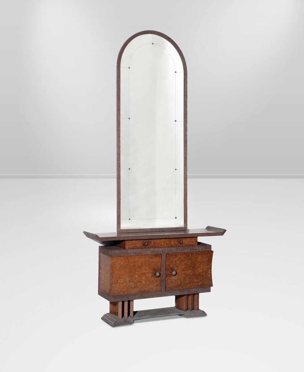 A thuya and root wood mirrored console with some parts decorated with etchings. Certificate of authenticity. From the Claudia Colli collection, Production of Colli, Italy, circa 1935