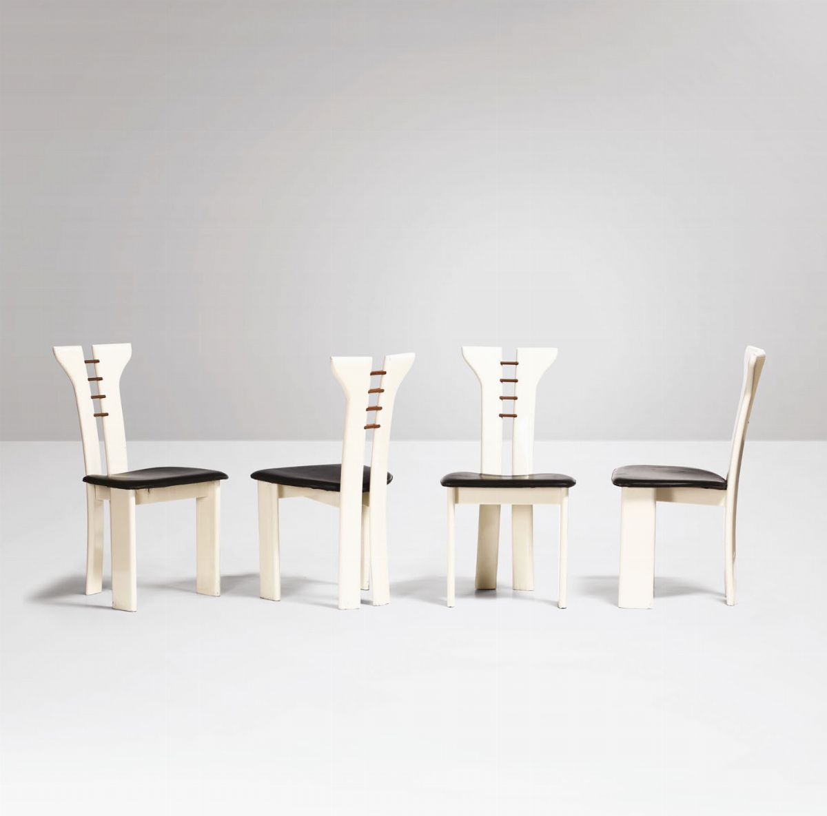 Quattro sedie con struttura in legno laccato e legno. Rivestimento in skai.