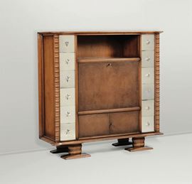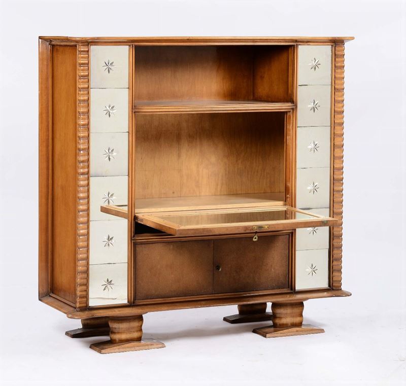Mobile bar in legno patinato, decorazioni in cristallo molato e specchiato.
