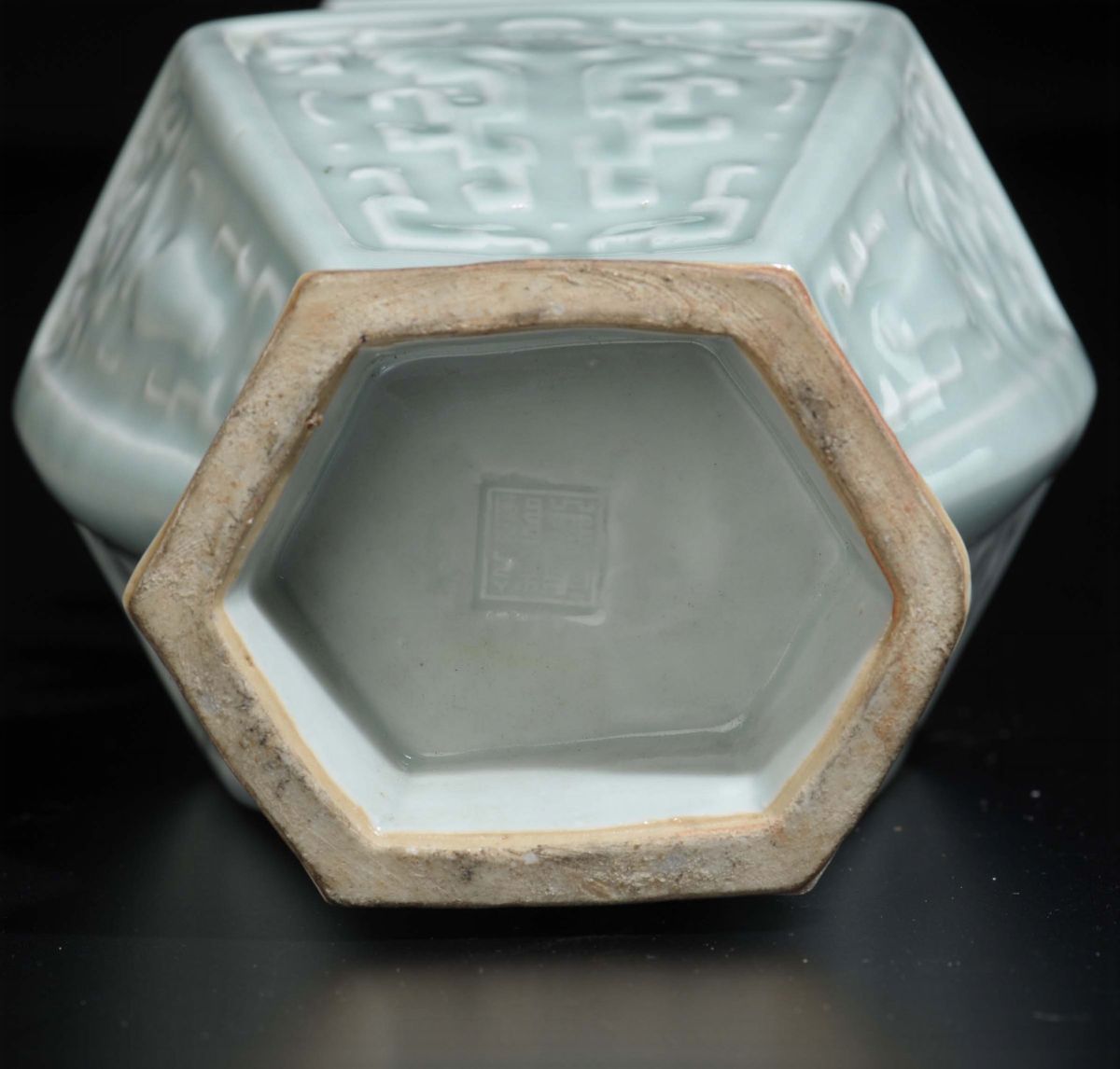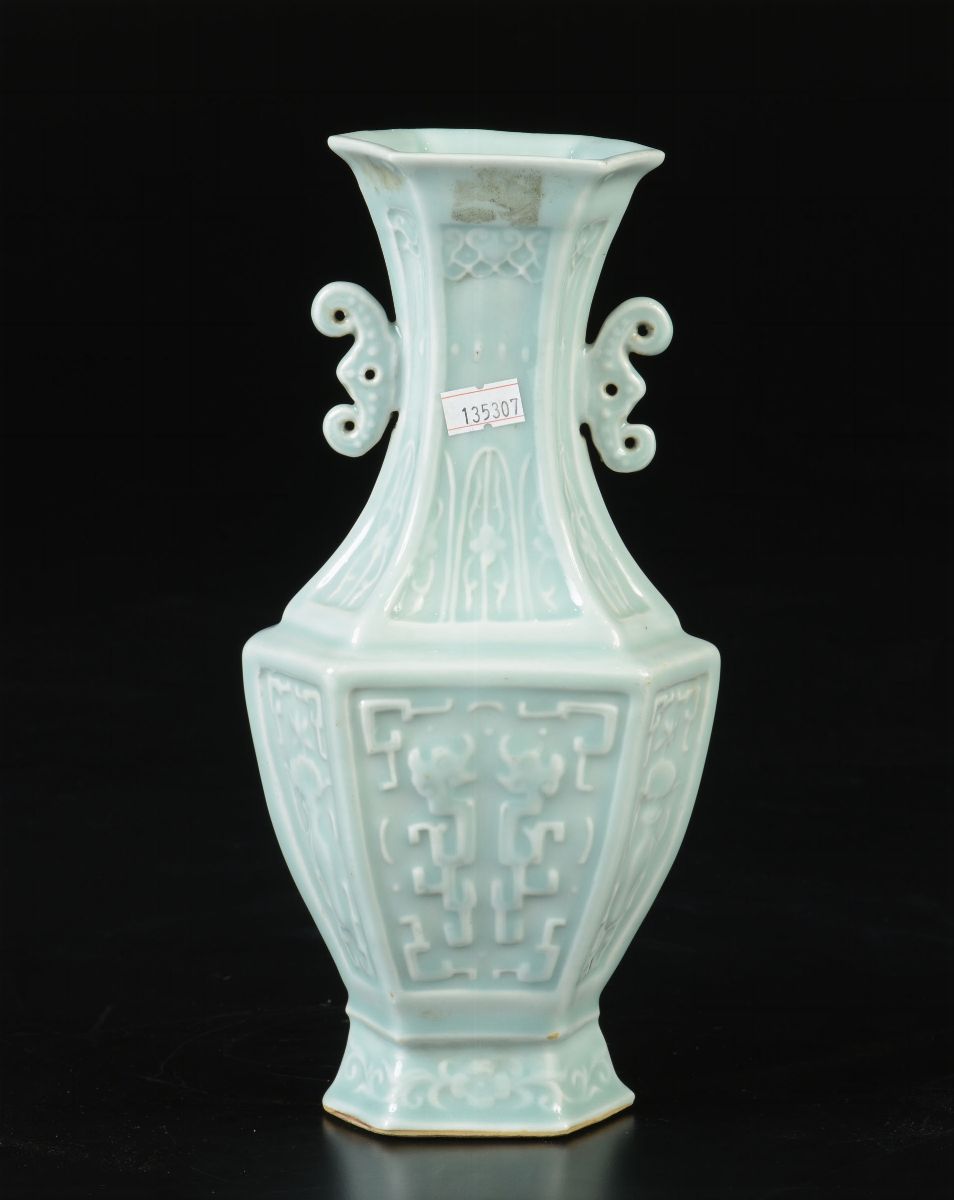 A Celadon porcelain hexagonal based vase with decoration in relief, China, Qing Dynasty, 19th century