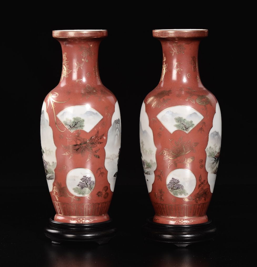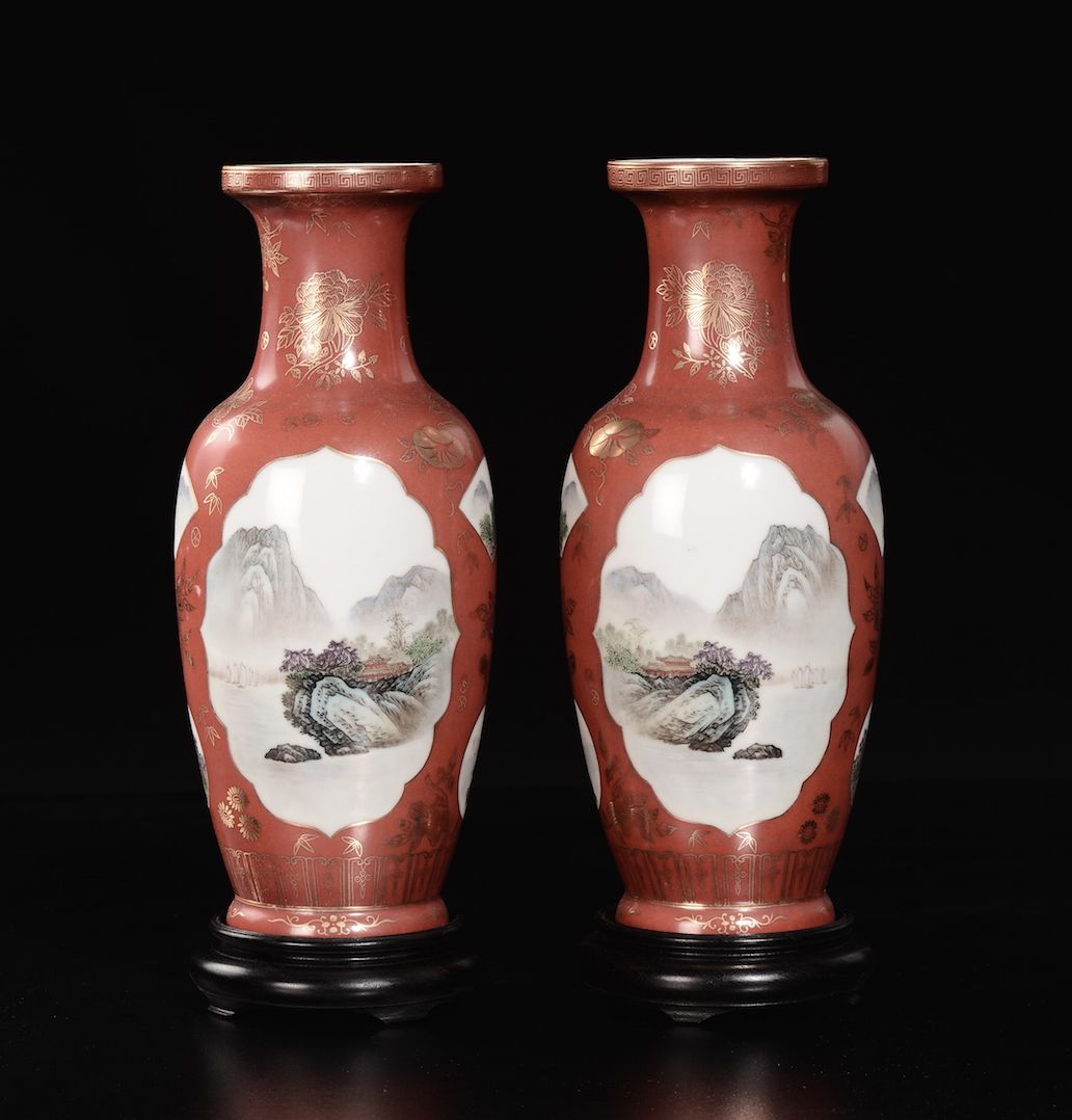 A pair of polychrome enamelled red-ground porcelain vases with a river landscape and trees within reserves, China, 20th [..]