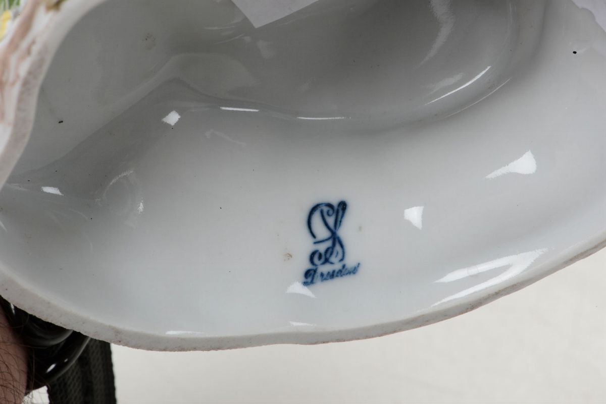 Porcellana policroma. Marca: “PS” incrociate e “Dresden” in blu. Altezza cm 26. Ottimo stato di conservazione
