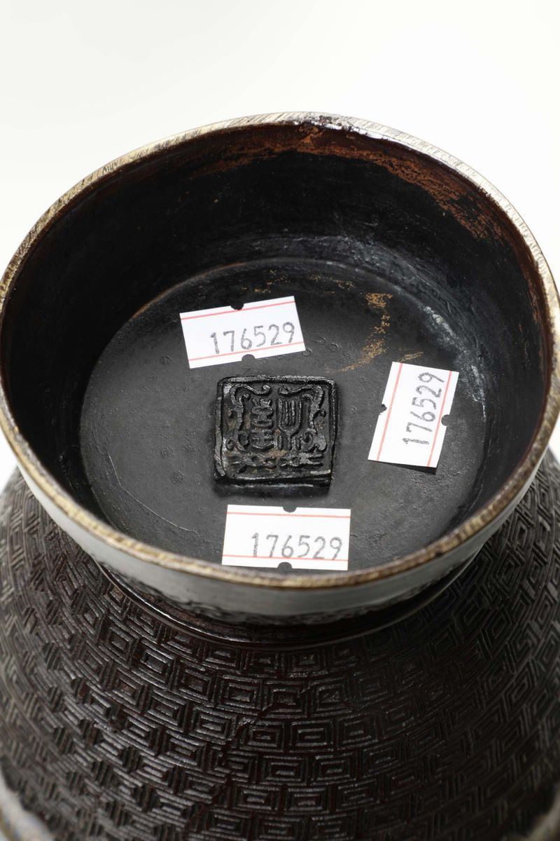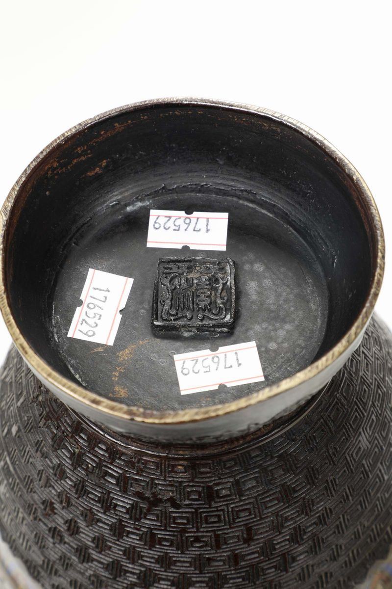 Coppia di vasi biansati in metallo e smalti cloisonnè, XX secolo
