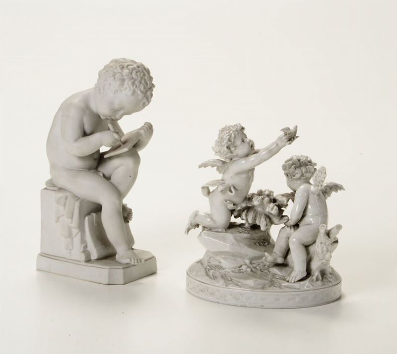 Gruppo in porcellana bianca Capodimonte raffigurante putti e statuina in biscuit, XX secolo