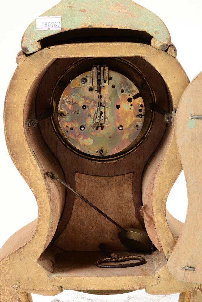 Cassa sagomata dipinta in policromia a motivo floreale, quadrante a numerazione romana, cm 21x11x43