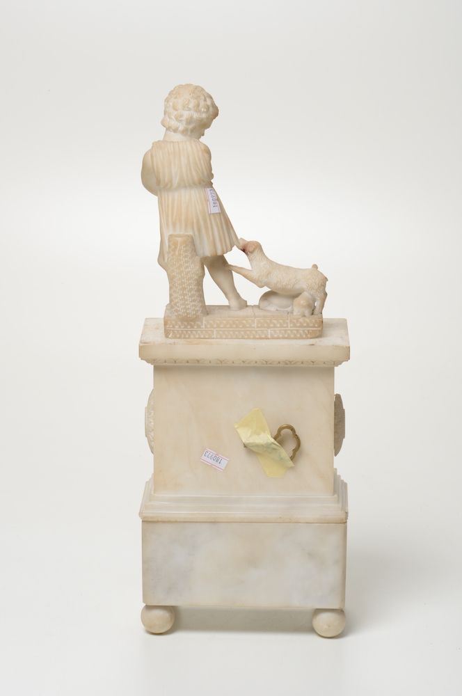 Cassa decorata con figura di bambino con cani sulla sommità, quadrante smaltato a numerazione araba, altezza cm 45