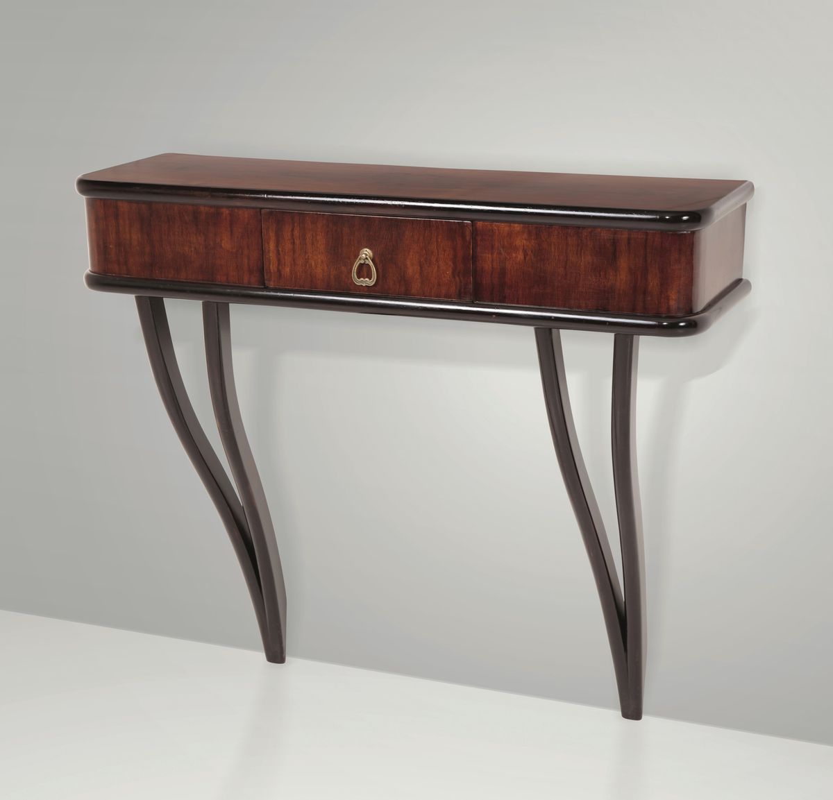 Consolle a parete con struttura in legno e legno ebanizzato.