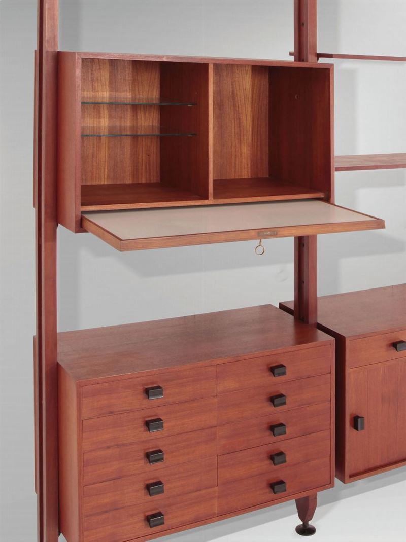 Libreria modulare con struttura in legno e dettagli in metallo. Piani in vetro.