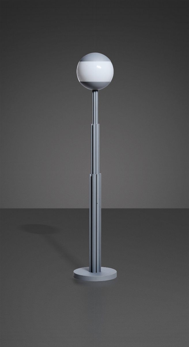 Lampada da terra in alluminio smaltato e vetro opalino.