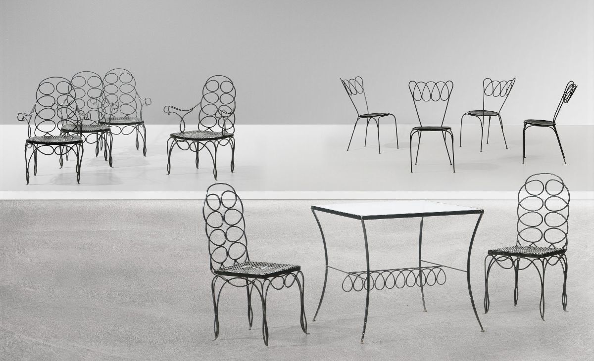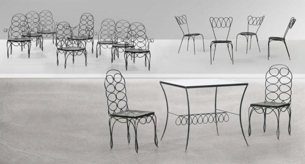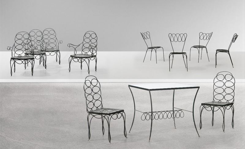 Set da esterno composto da un tavolo, otto poltrone, coppia di sedie e quattro sedie in metallo laccato.