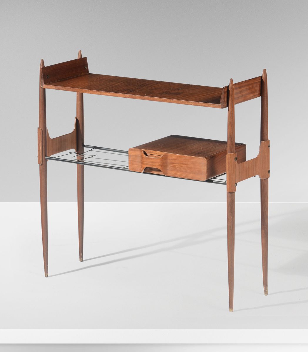 Consolle in legno, compensato curvato e metallo laccato.
