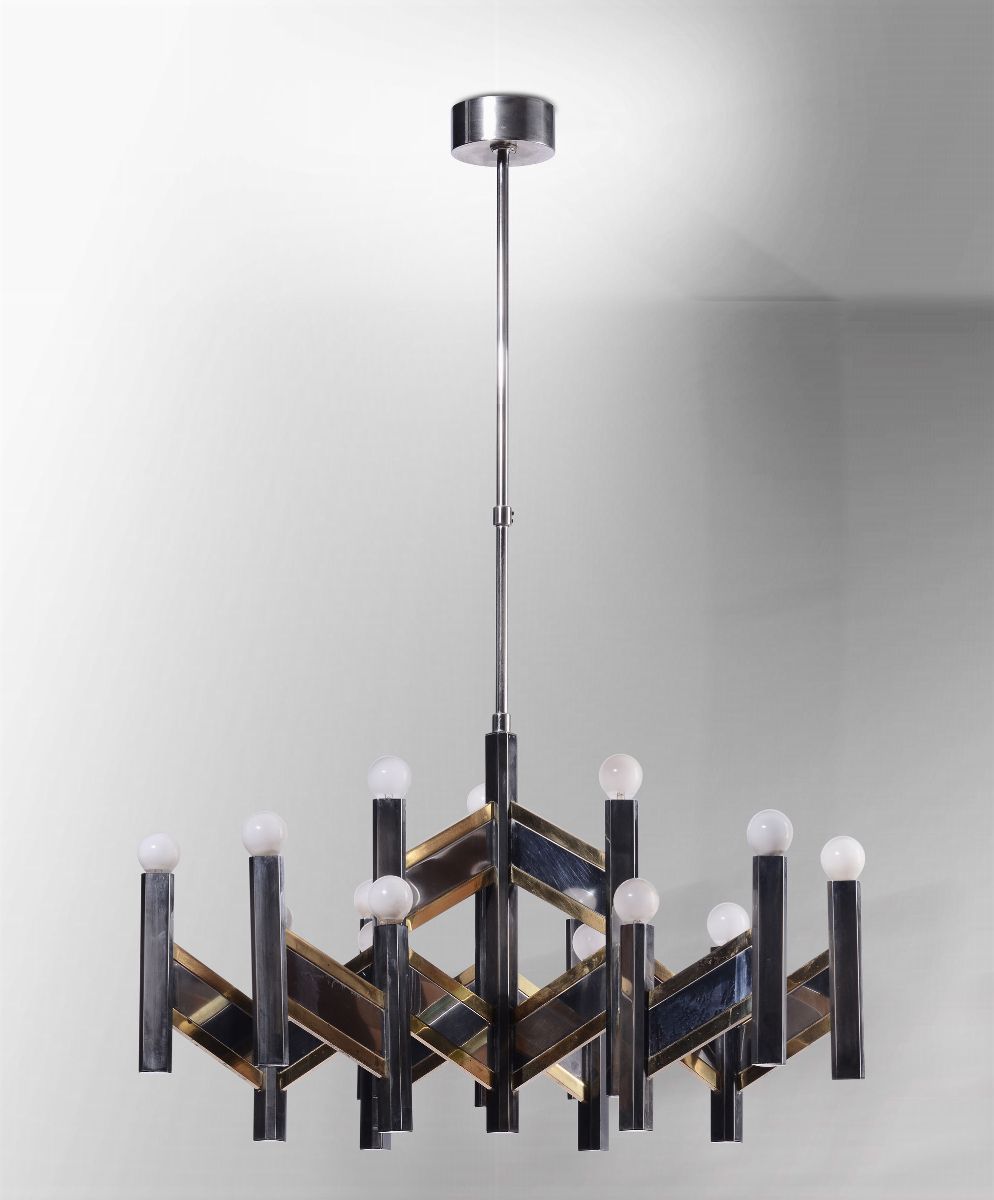 Lampada a sospensione con struttura in ottone e acciaio. Etichetta originale.