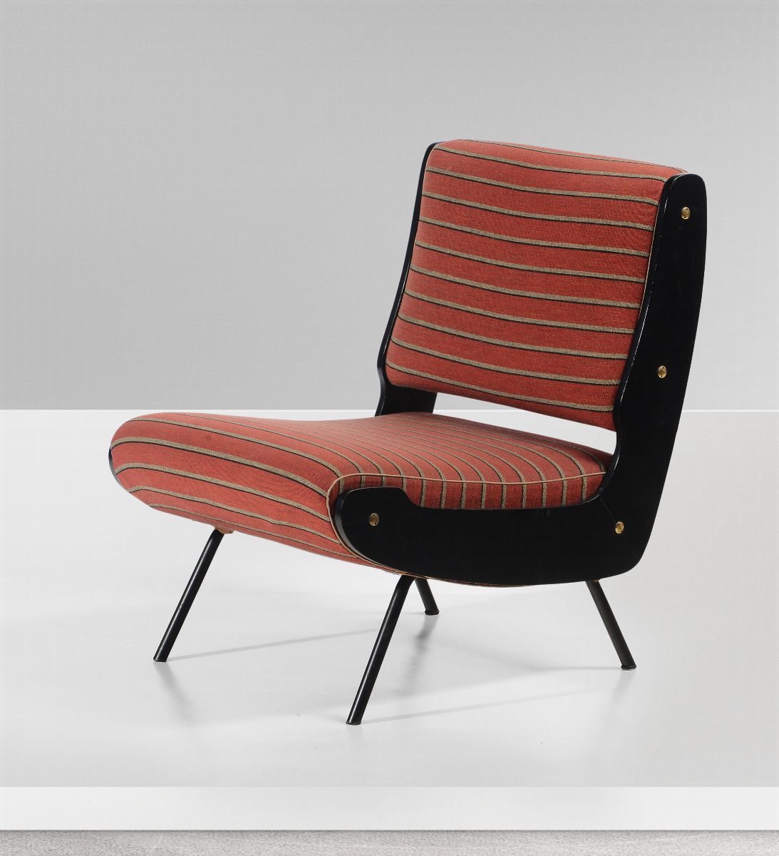 Poltrona mod. 836 con struttura in legno e metallo, particolari in ottone, sostegni in metallo laccato e rivestimenti in tessuto.