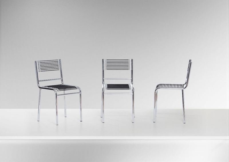 Sei sedie mod. Sandows con struttura in metallo cromato e seduta in corda elastica.