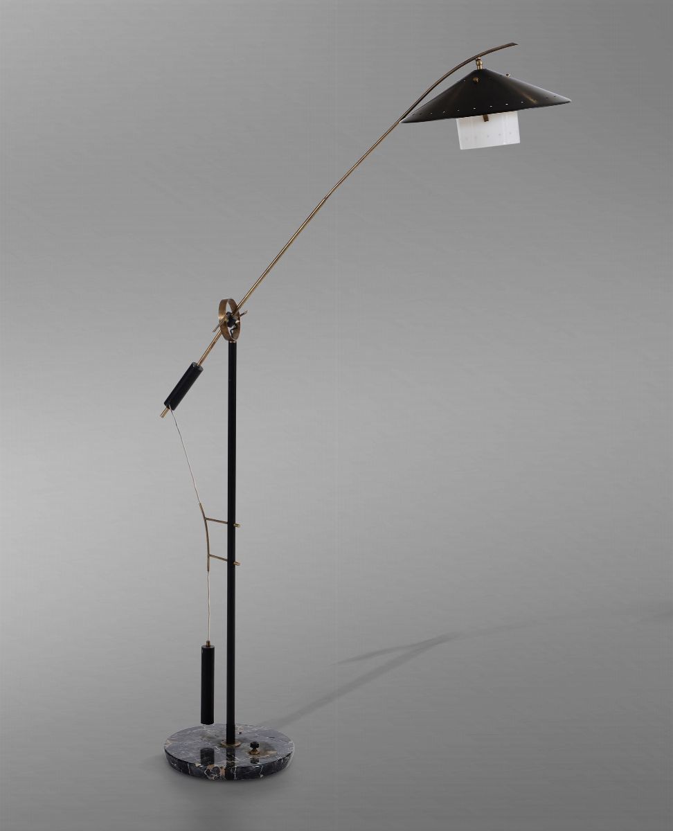Lampada da terra basculante con base in marmo, struttura in ottone e ottone laccato. Diffusore in metallo laccato e plexiglass.
