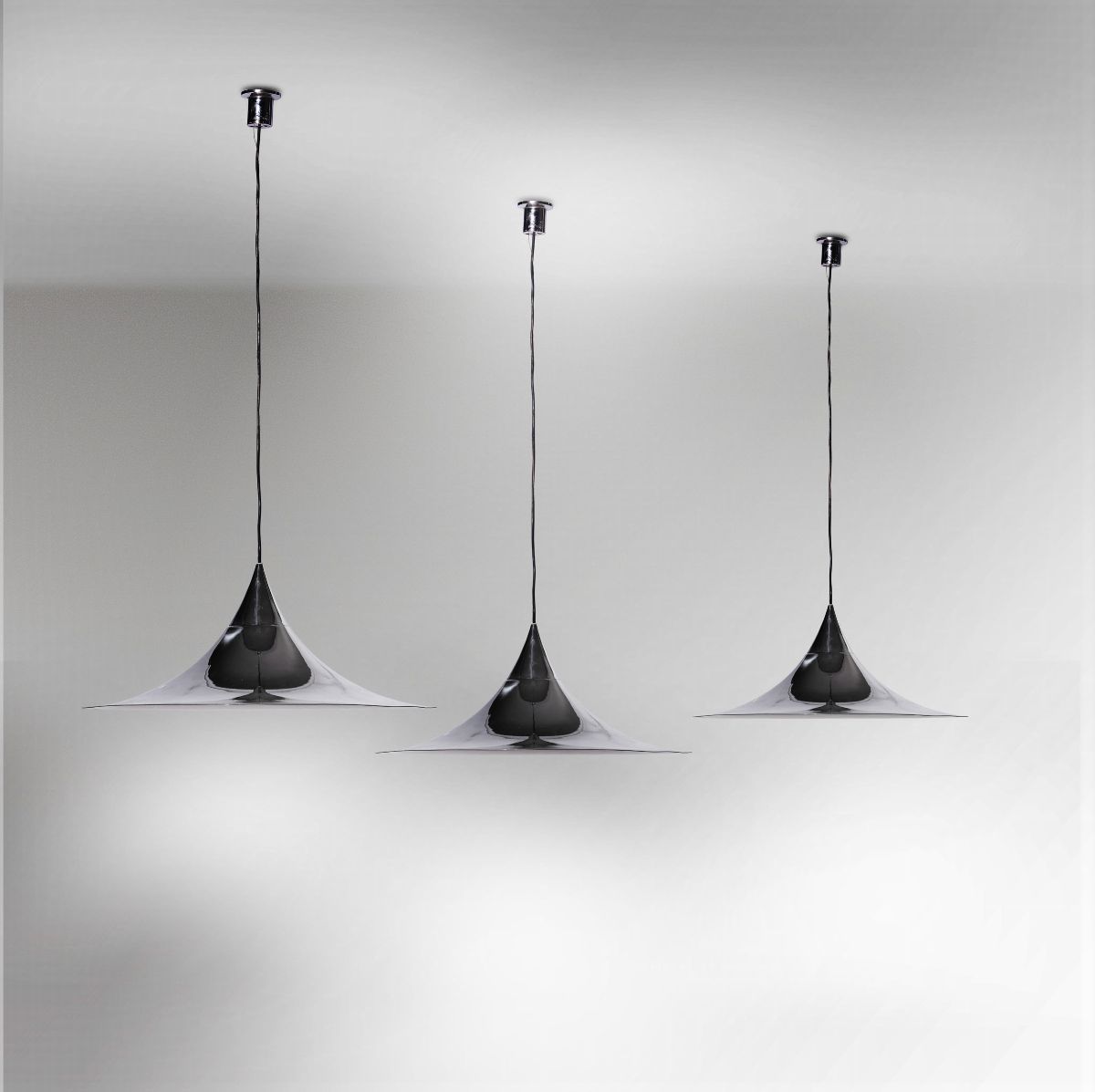 Tre lampade a sospensione struttura in metallo cromato.