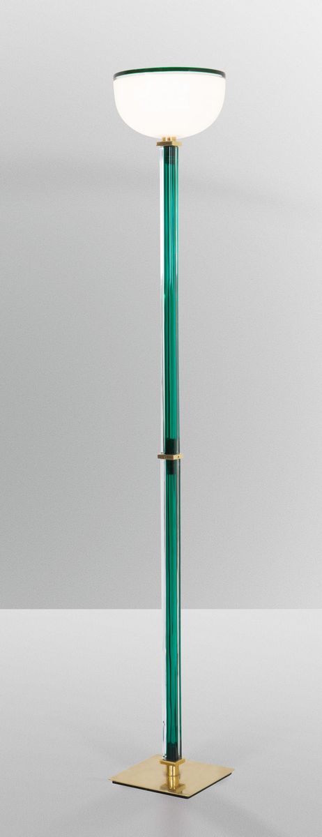Lampada da terra mod. Tolboi in vetro soffiato lavorato a mano. Struttura in ottone e diffusore in vetro lattimo.