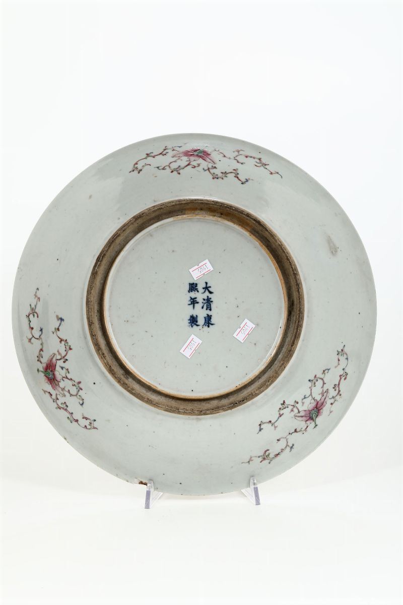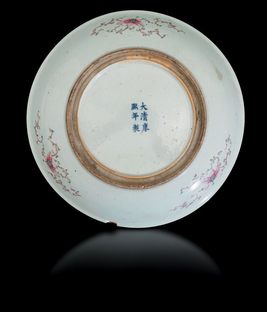 Pink Family porcelain with a dragon and phoenix among the clouds. Apocryphal Kangxi mark. Diam 37cm