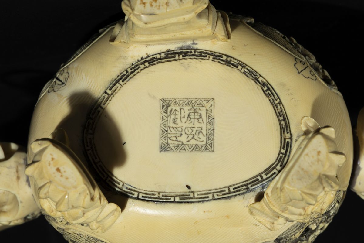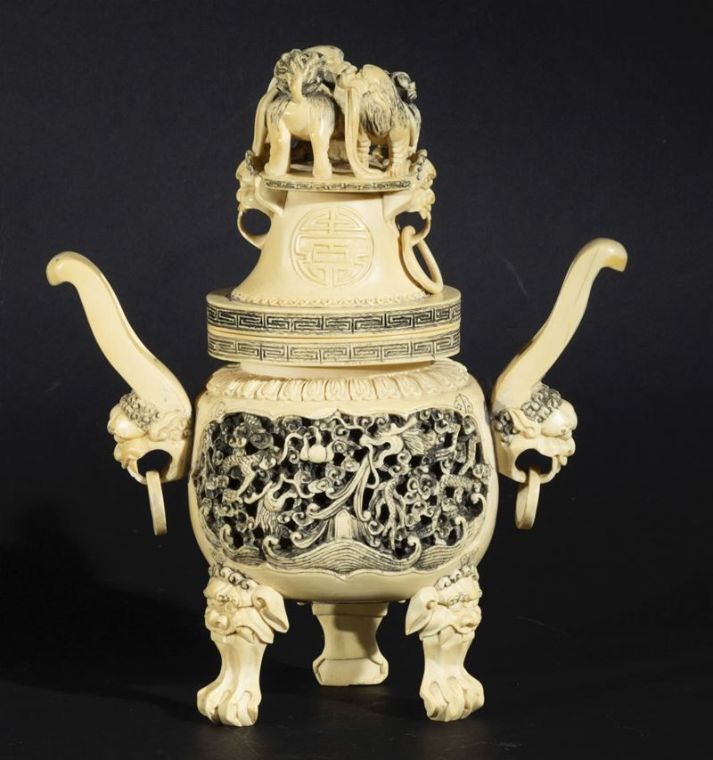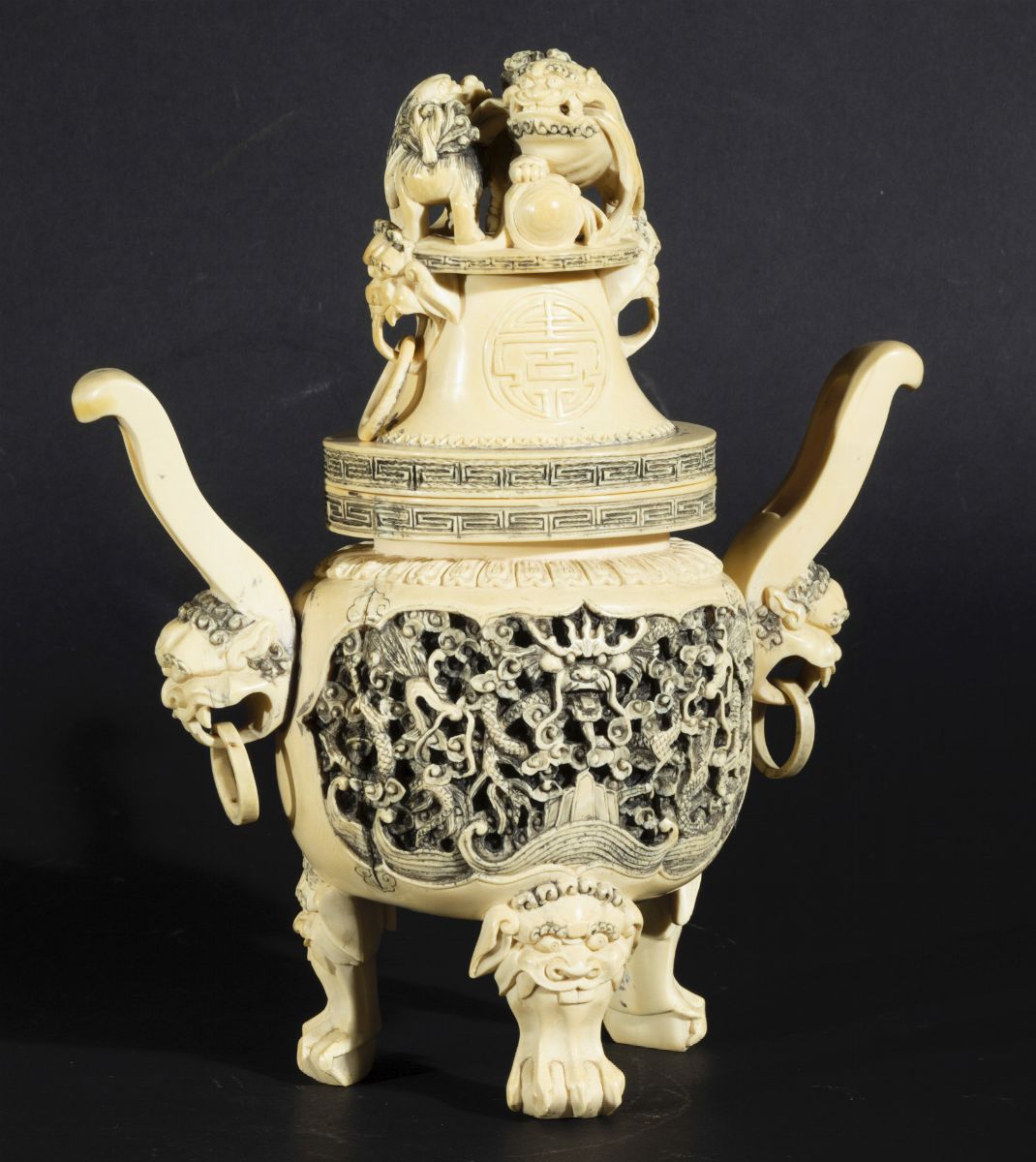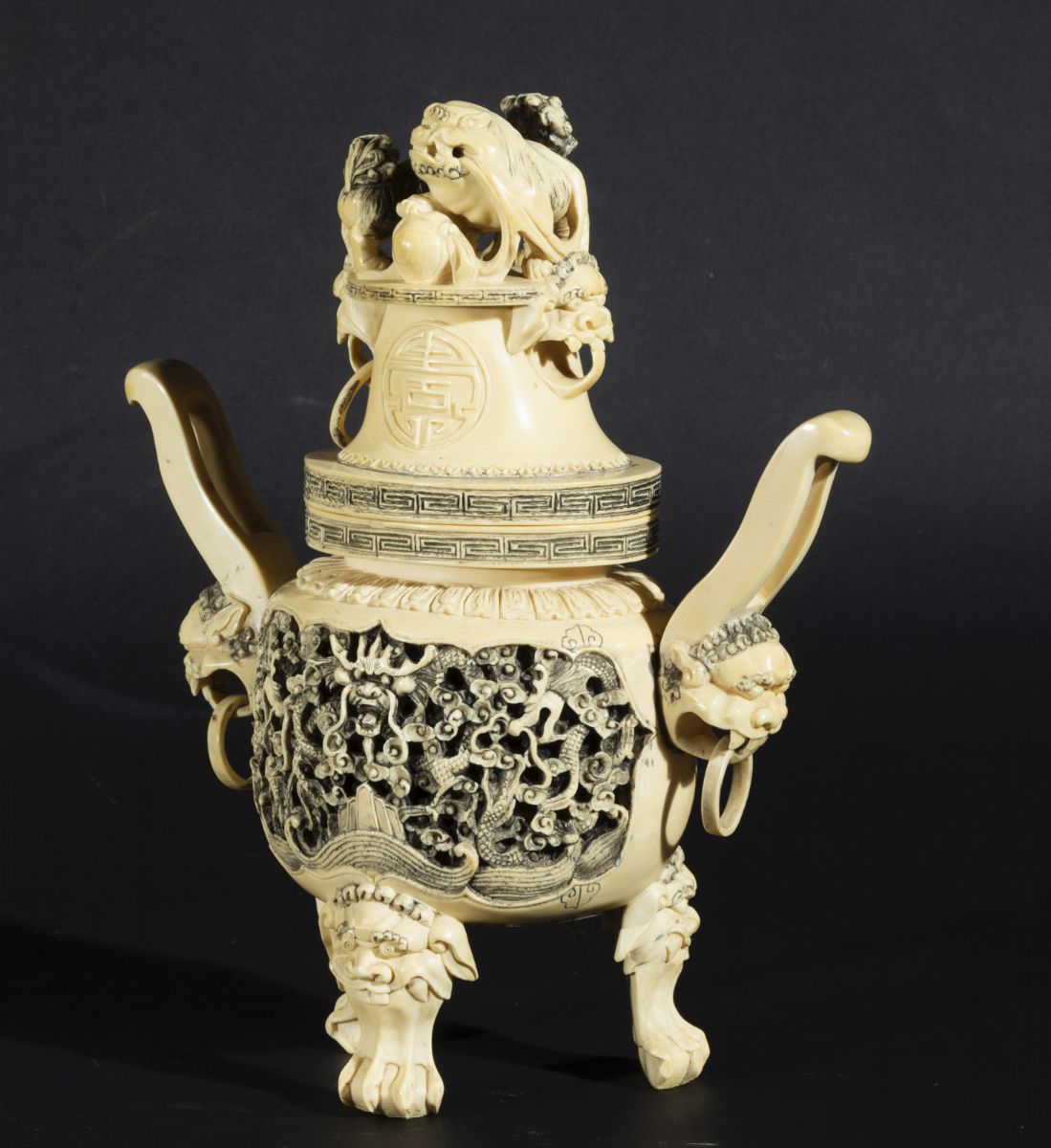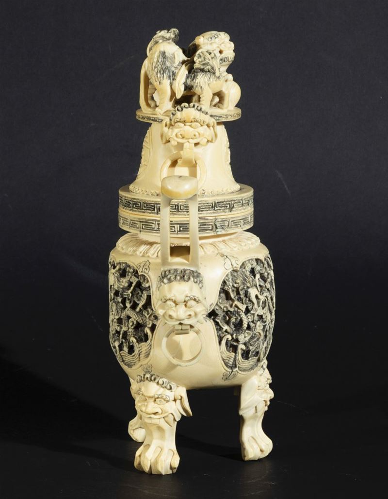 Carved with a decor of dragons and with a Pho dog-shaped lid. H 30cm
