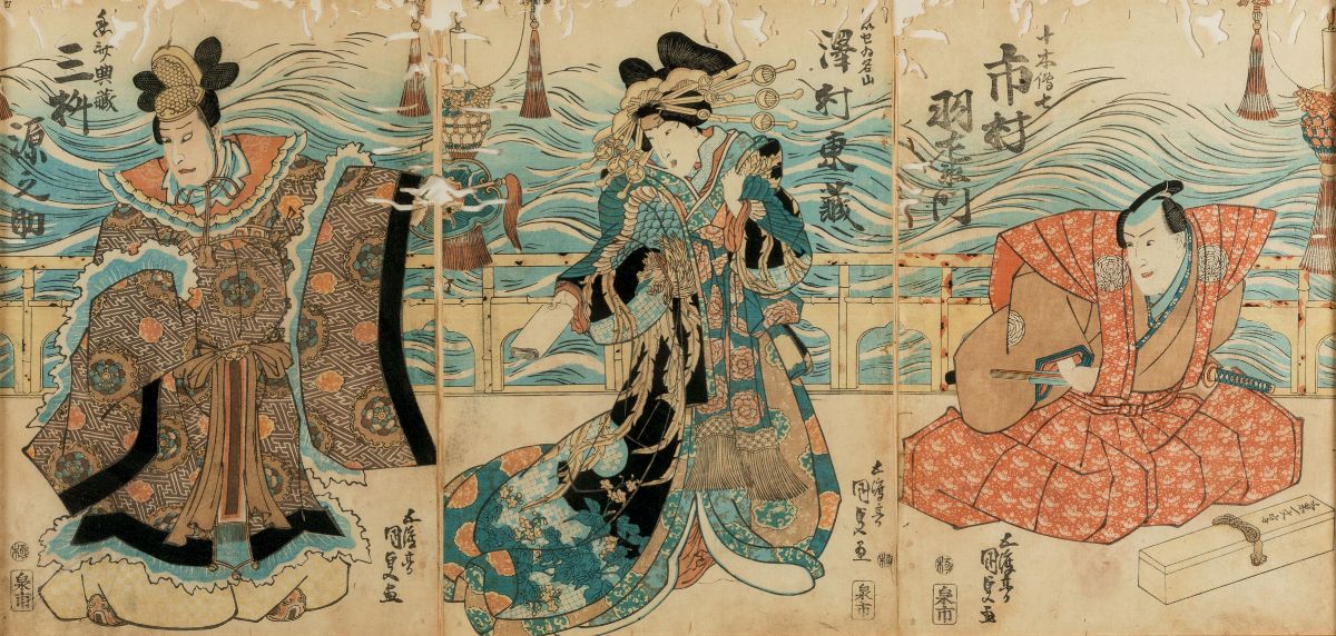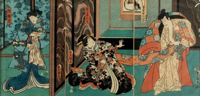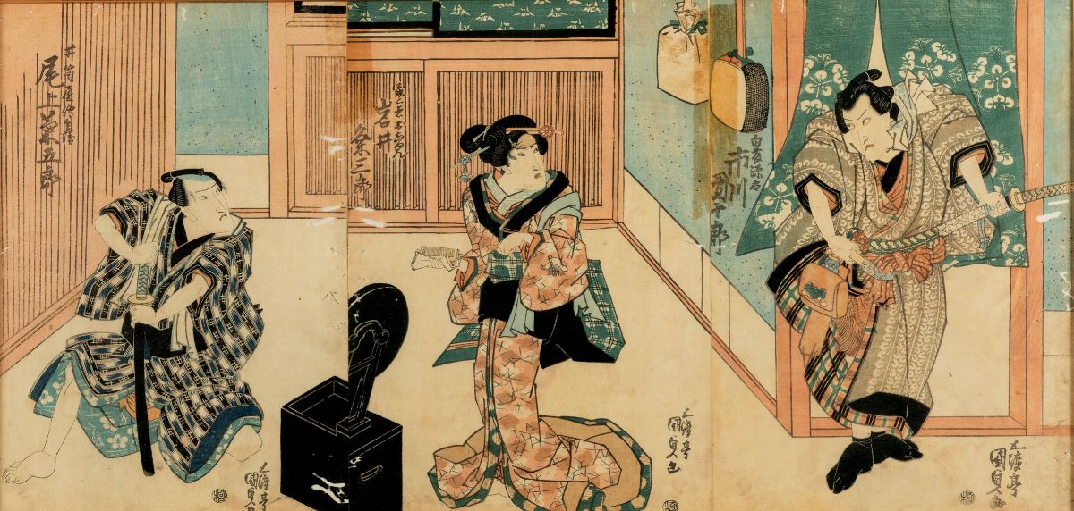 (1868-1912). Depicting everyday life scenes with Geishas and Samurais. 35x72.5cm