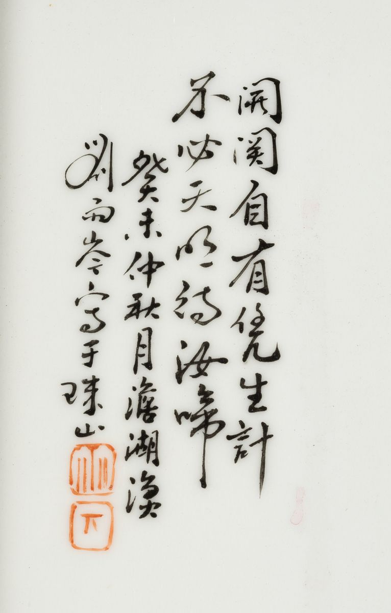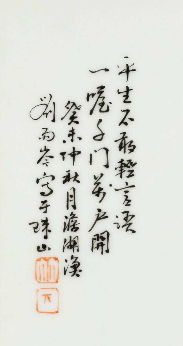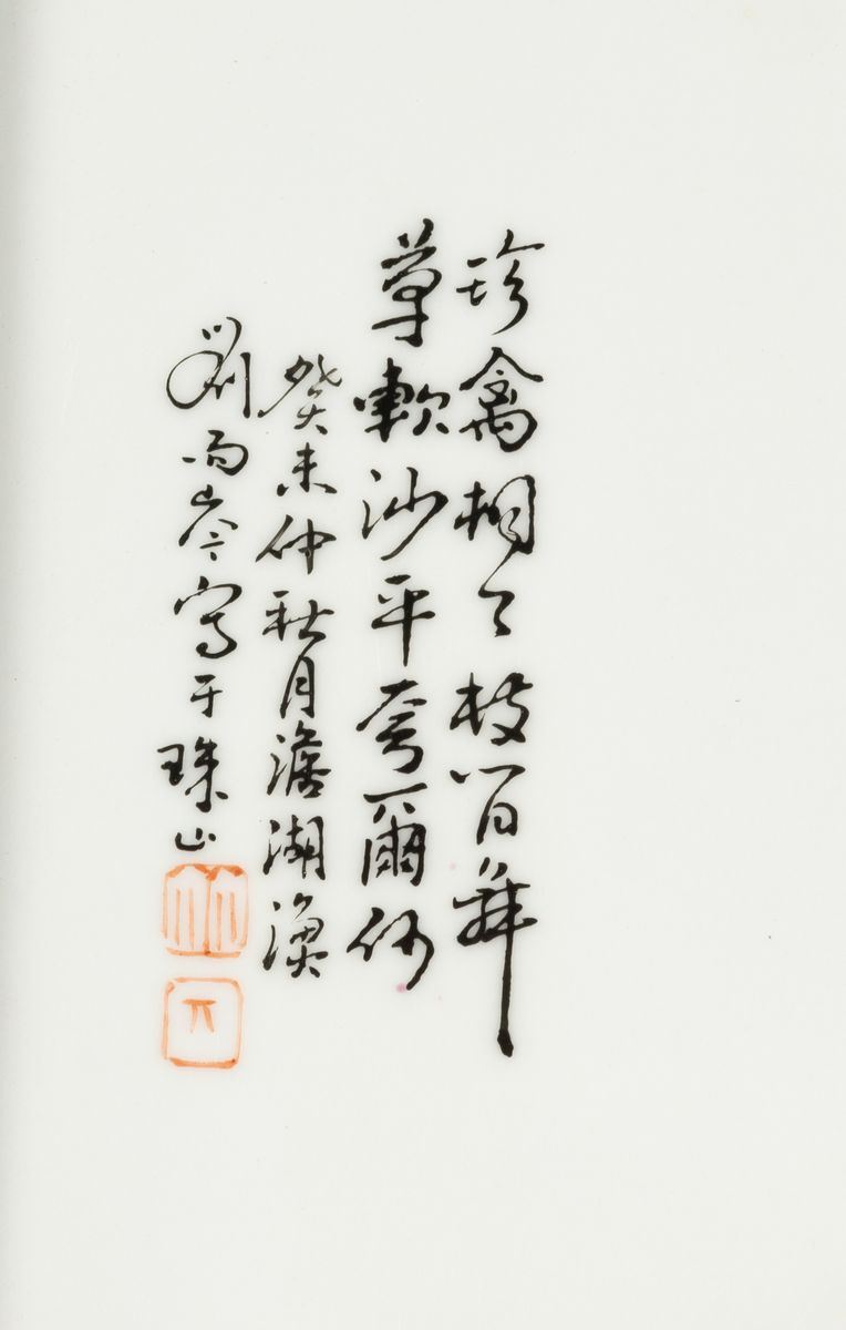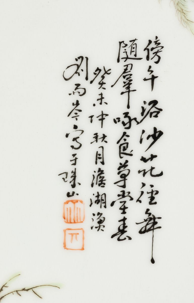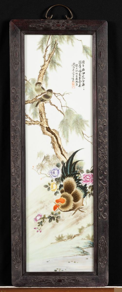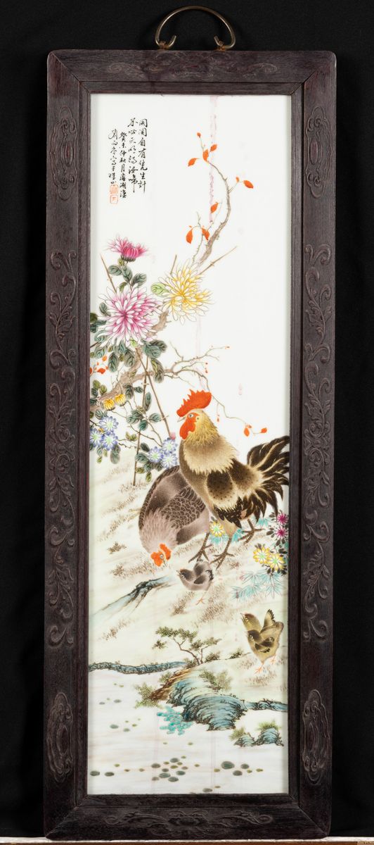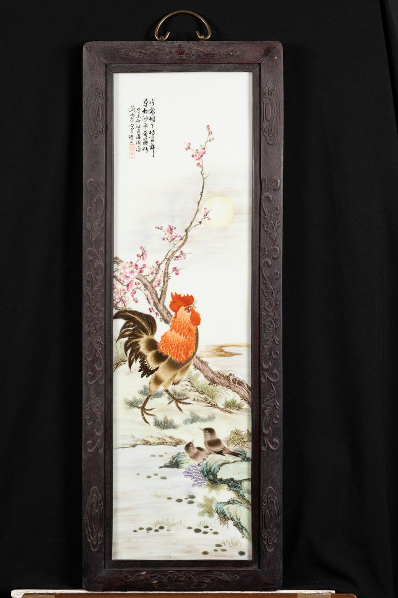 Polychrome enamels with roosters and inscriptions. 82.5x30cm