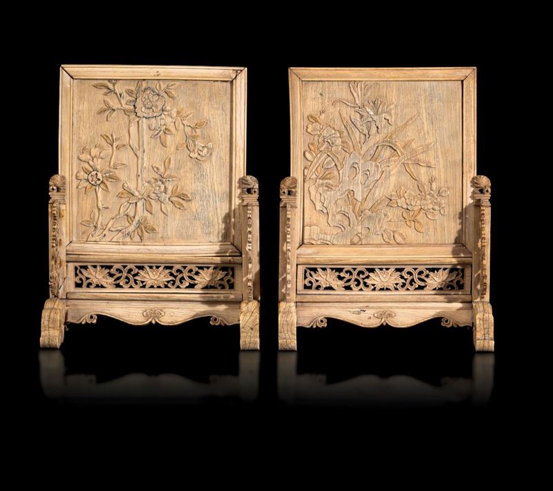 Two ivory table screens on stands, China, Qing Dynasty