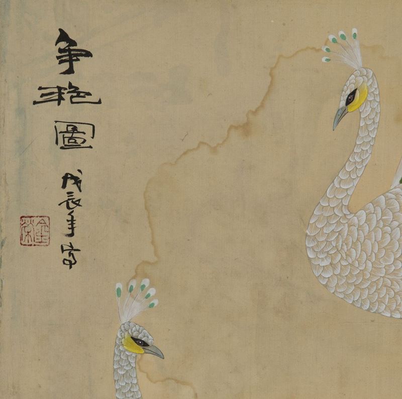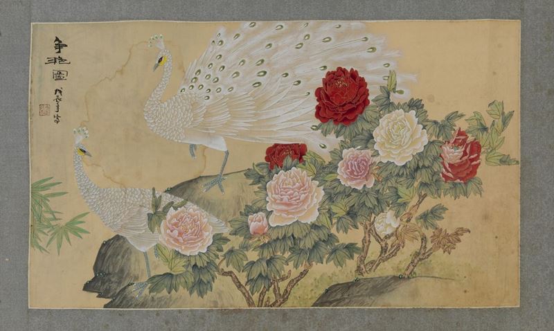 Depicting peacocks with peonies and inscriptions. 50.5x86.5cm