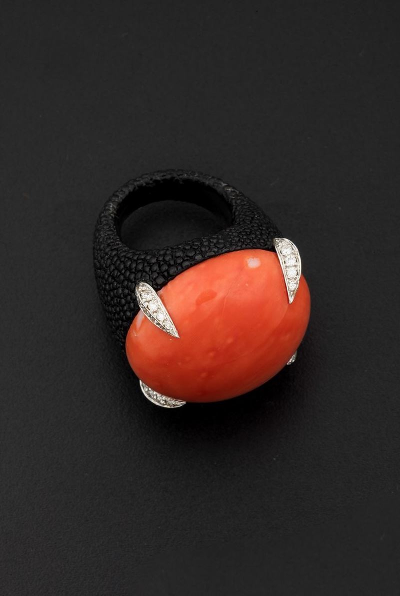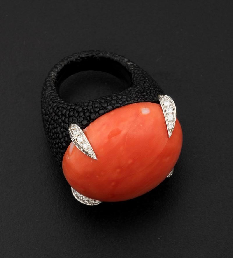 Coral, diamond, gold and resin ring