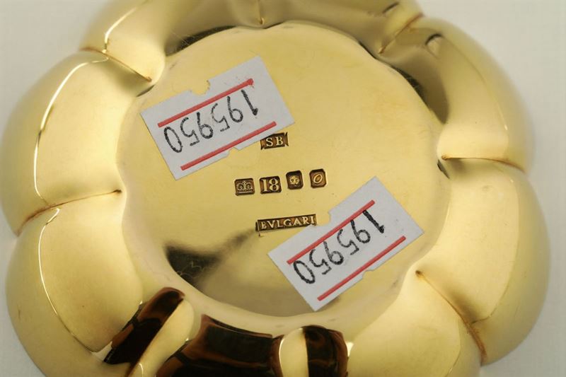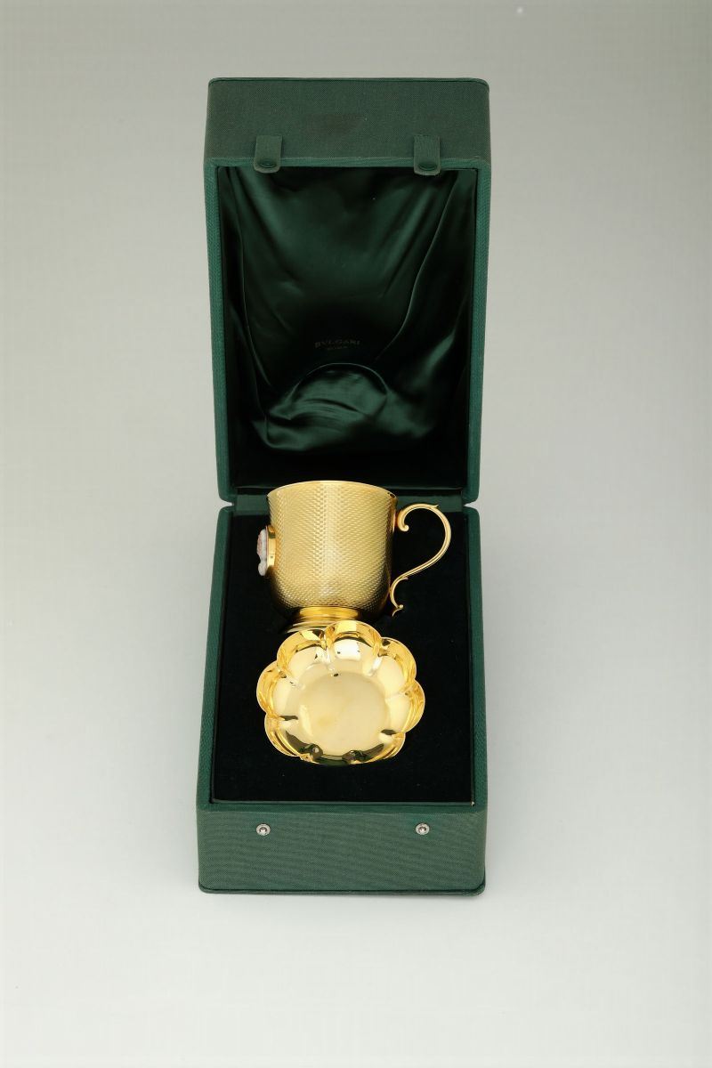 Prezioso insieme ideato della Maison Bulgari per una importante committenza romana composto da un boccale monoansato a corpo svasato decorato con motivo a canestro e centrato da castone contenente cammeo ovale inciso raffigurante testa virile laureata e piatto circolare con tesa lobata corredata da custodia con impresso il marchio Bulgari.