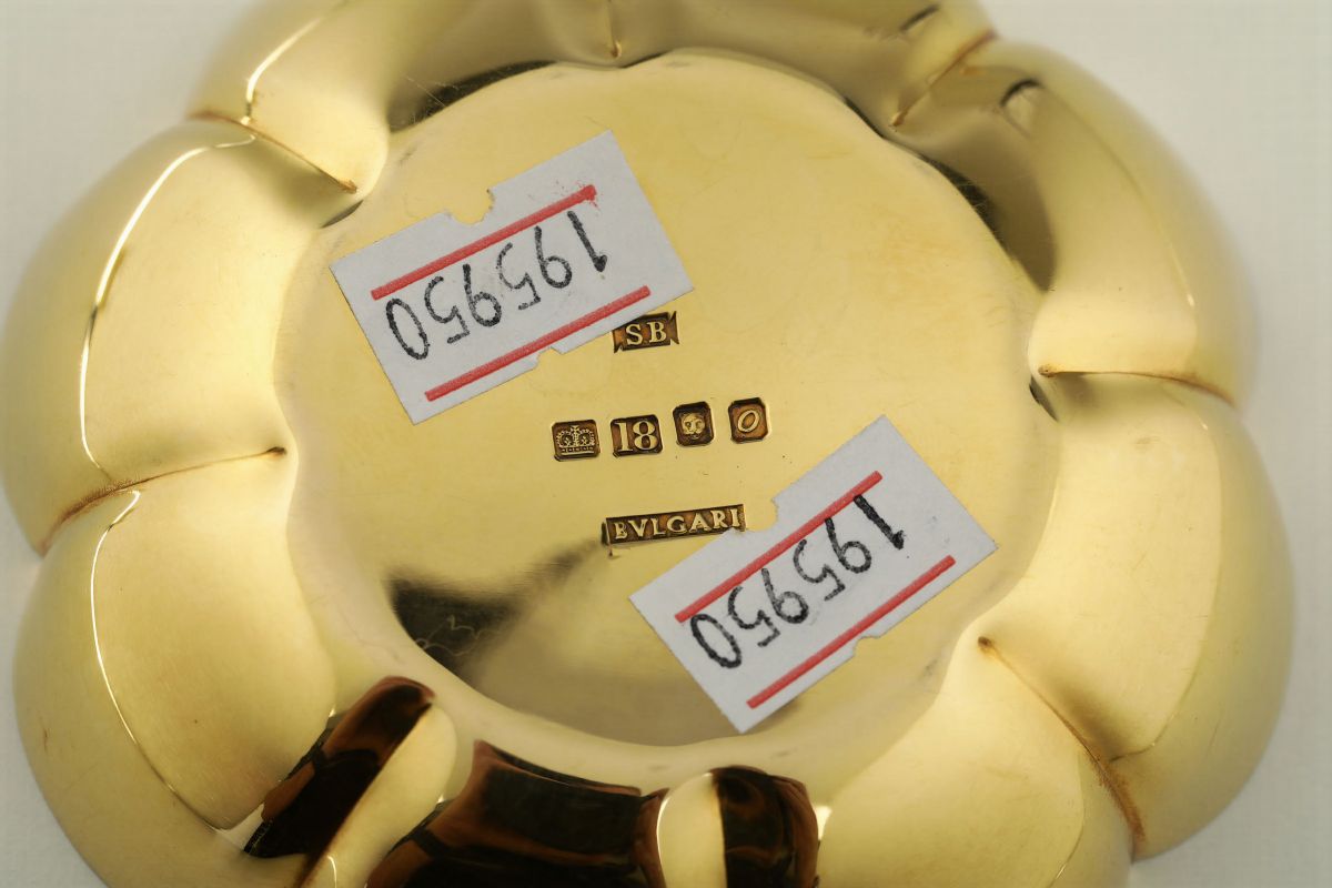 Boccale con cammeo incastonato raffigurante filosofo e piccolo piatto in oro. Boccale Italia (?) XIX-XX secolo con cammeo neoclassico probabilmente Roma fine XVIII inizio XIX secolo, apparentemente privo di punzonatura. Piatto Inghilterra, seconda metà del XX secolo per la Maison Bulgari “Collezione Safirio Bulgari”