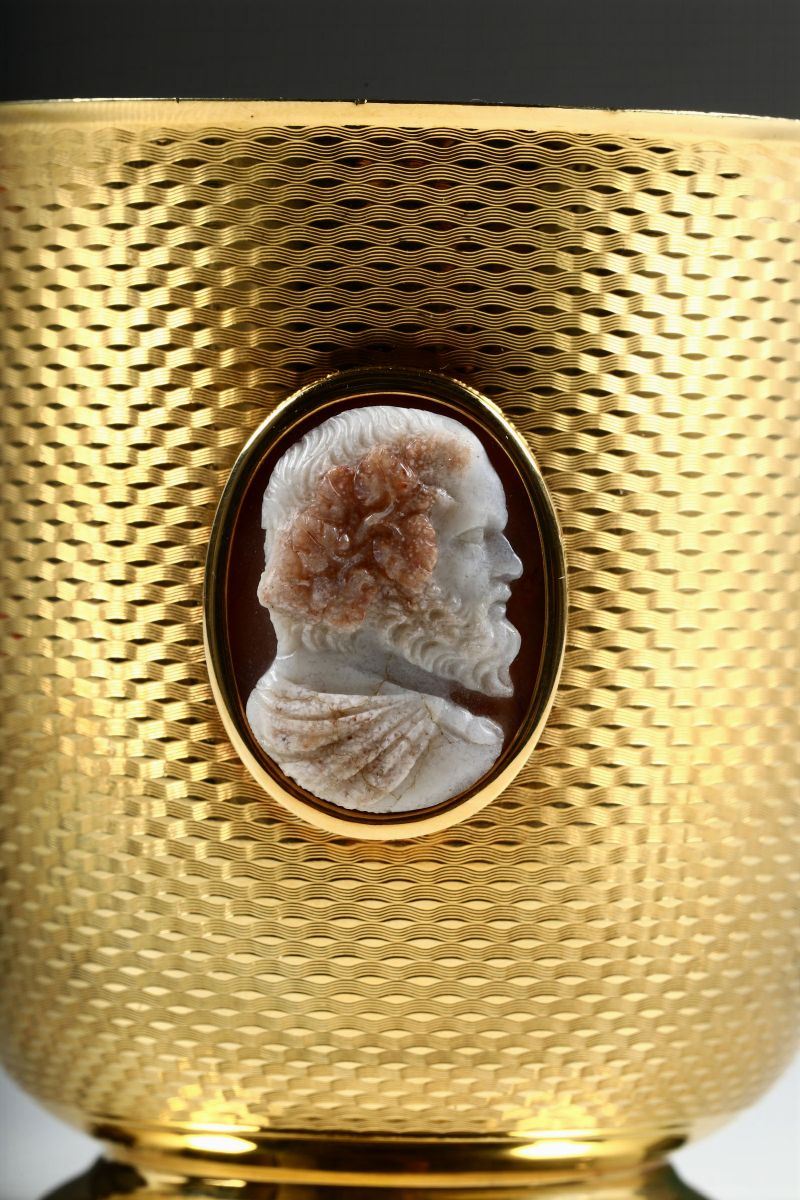 Boccale con cammeo incastonato raffigurante filosofo e piccolo piatto in oro. Boccale Italia (?) XIX-XX secolo con cammeo [..]