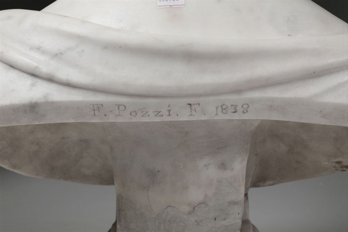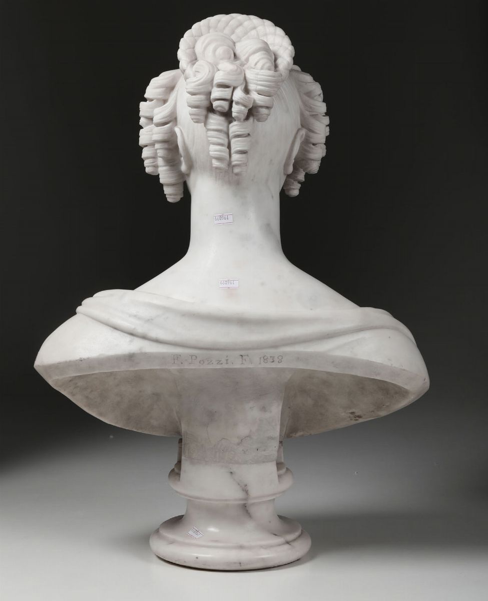 Busto di gentildonna in marmo bianco. Arte neoclassica italiana del XIX secolo. reca iscrizione scolpita sul verso: “F.Pozzi f. 1838”