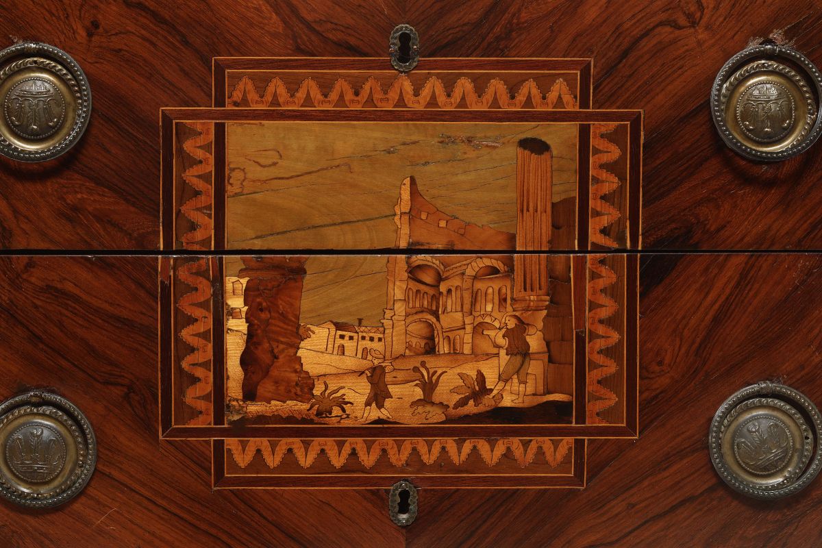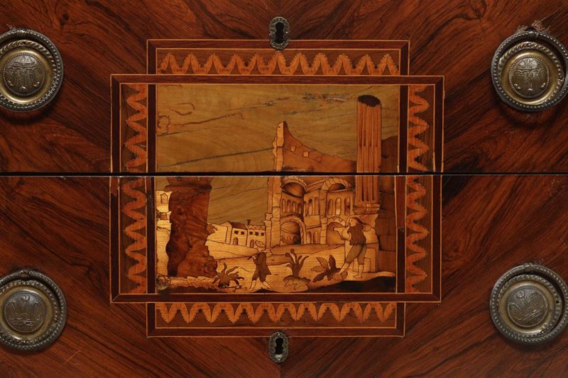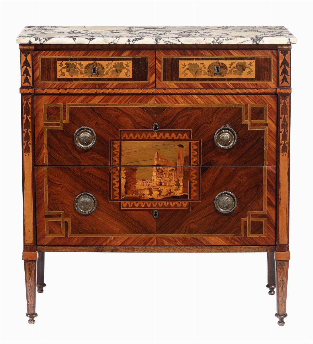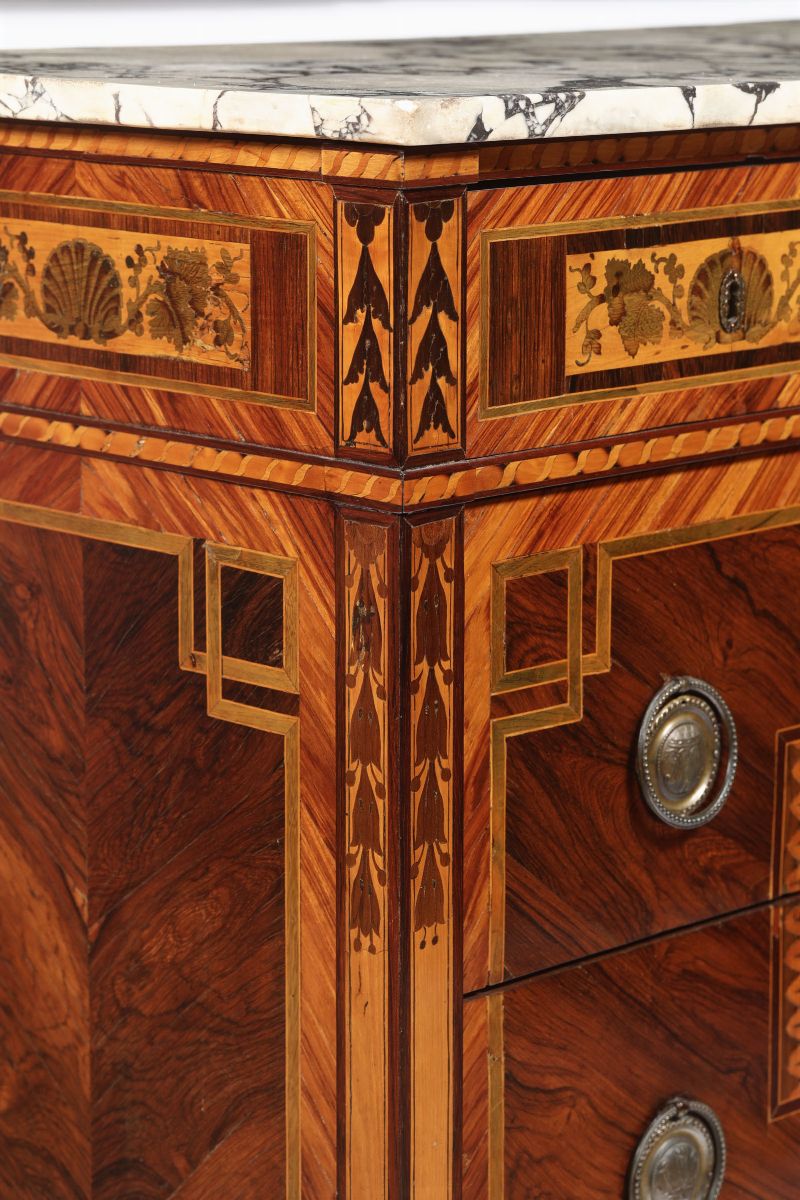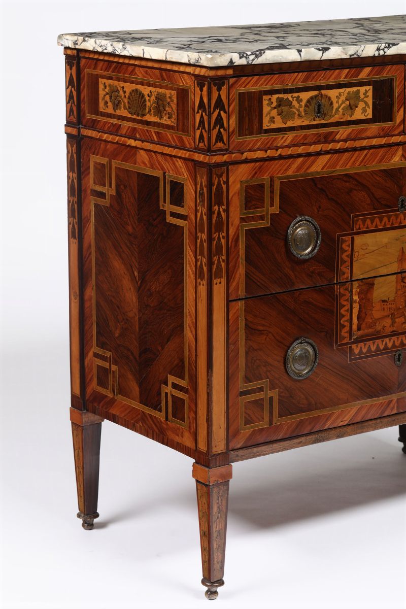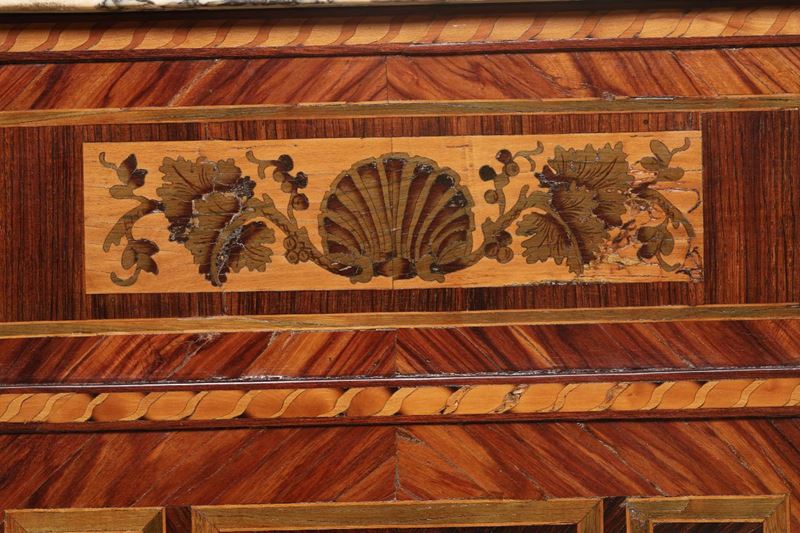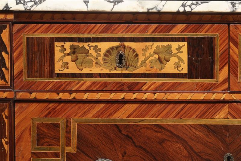 Cassettone Luigi XVI lastronato ed intarsiato in essenze pregiate, XVIII secolo