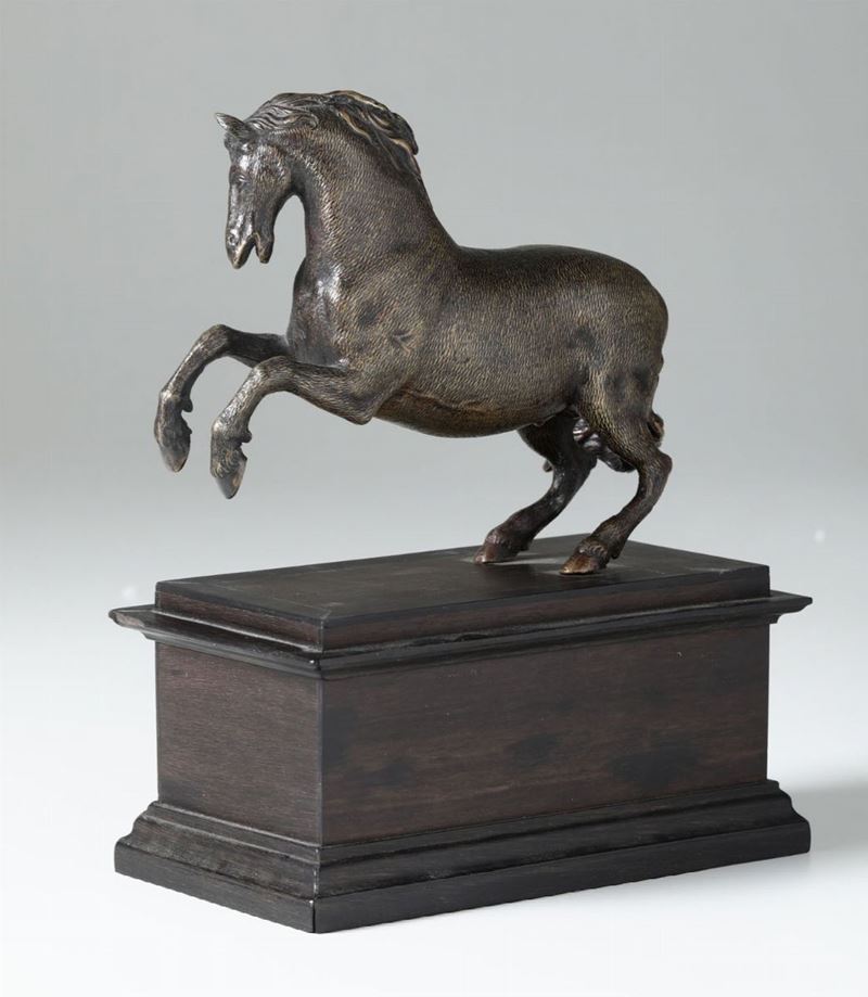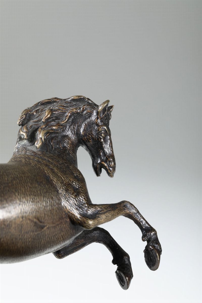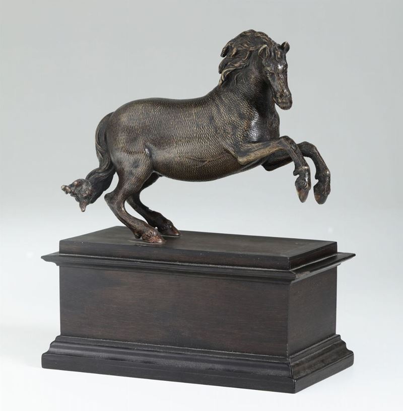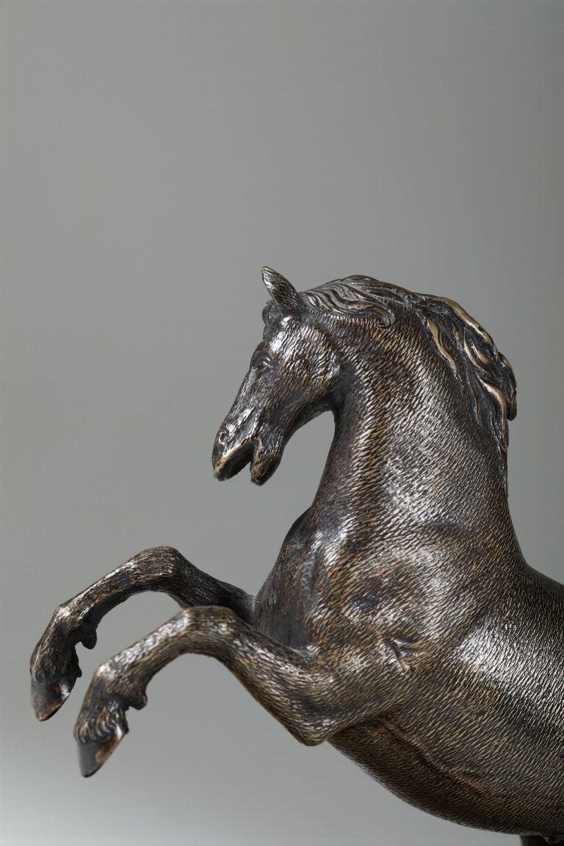 Cavallo che si impenna. Bronzo fuso e cesellato. Base a plinto in legno ebanizzato. Fonditore prossimo a Francesco Fanelli (Firenze 1590 - Parigi 1653). Operante nel XVII secolo