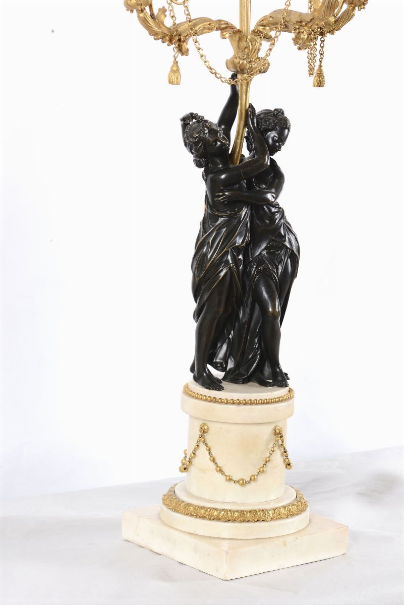 fusto centrale con figure femminili a tuttotondo a sorreggere i bracci a guisa di cornucopia poggianti su basi in marmo bianco